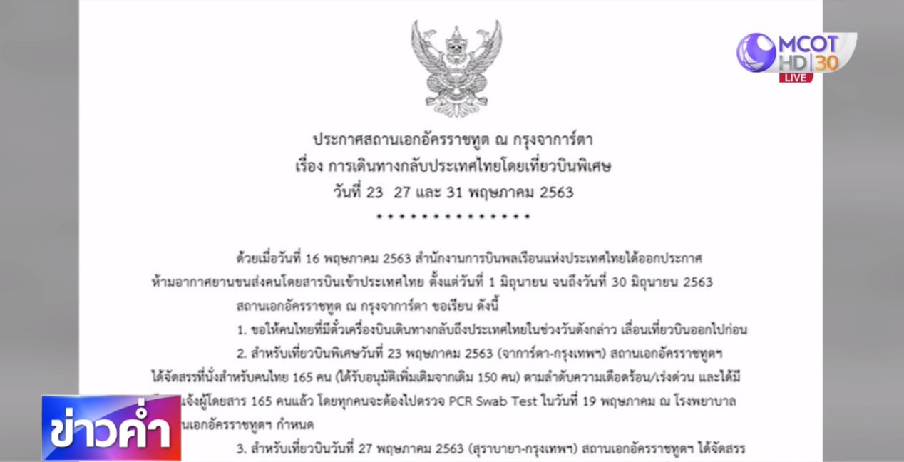 ทั้งนี้ ผู้โดยสารที่จะเดินทางกลับไทยด้วยเที่ยวบินพิเศษจะต้องไปตรวจ PCR Swab Test หาเชื้อโควิด-19 ที่โรงพยาบาลที่สถานเอกอัครราชทูตแจ้งไป ซึ่งทางสถานทูตจะรับผิดชอบค่าใช้จ่ายในการตรวจให้ หากผลตรวจออกมาเป็นบวก จะไม่ได้เดินทางกลับด้วยเที่ยวบินพิเศษ