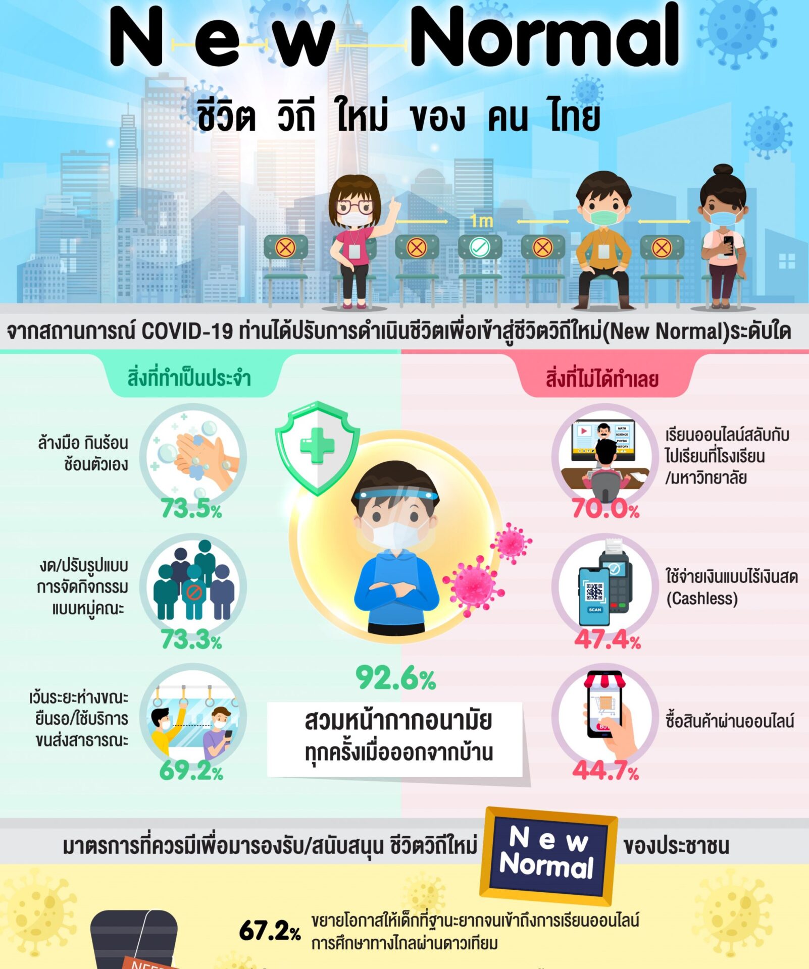 สืบเนื่องจากสถานการณ์ COVID-19 ประชาชนได้ปรับการดำเนินชีวิตเพื่อเข้าสู่ชีวิตวิถีใหม่ (New Normal) โดยพบว่าสิ่งที่ประชาชนส่วนใหญ่ร้อยละ 92.6 ปฏิบัติเป็นประจำคือ สวมหน้ากากอนามัยทุกครั้งเมื่อออกจากบ้าน รองลงมาร้อยละ 73.5 คือ ล้างมือ กินร้อน ช้อนตัวเอง และร้อยละ 73.3 คือ งด/ ปรับรูปแบบการจัดกิจกรรม งานเลี้ยงสังสรรค์แบบหมู่คณะ ให้มีระยะห่าง
