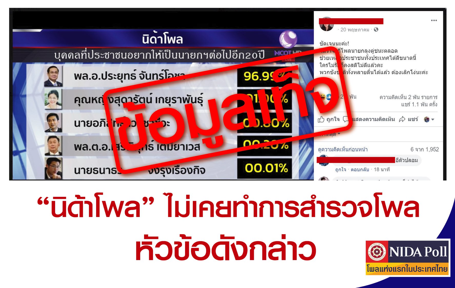 ขณะที่นิด้าโพล ก็ได้ออกมายืนยันแล้วเช่นกัน ว่า ตามที่มีการโพสต์ภาพพร้อมข้อความ โดยอ้างว่าเป็นผลสำรวจของ “นิด้าโพล” และมีการแชร์กันอย่างกว้างขวางนั้น ศูนย์สำรวจความคิดเห็น “นิด้าโพล” ขอชี้แจงว่า “นิด้าโพล” ไม่เคยทำการสำรวจในหัวข้อดังที่กล่าวอ้าง และข้อมูลทั้งหมดเป็นข้อมูลเท็จ