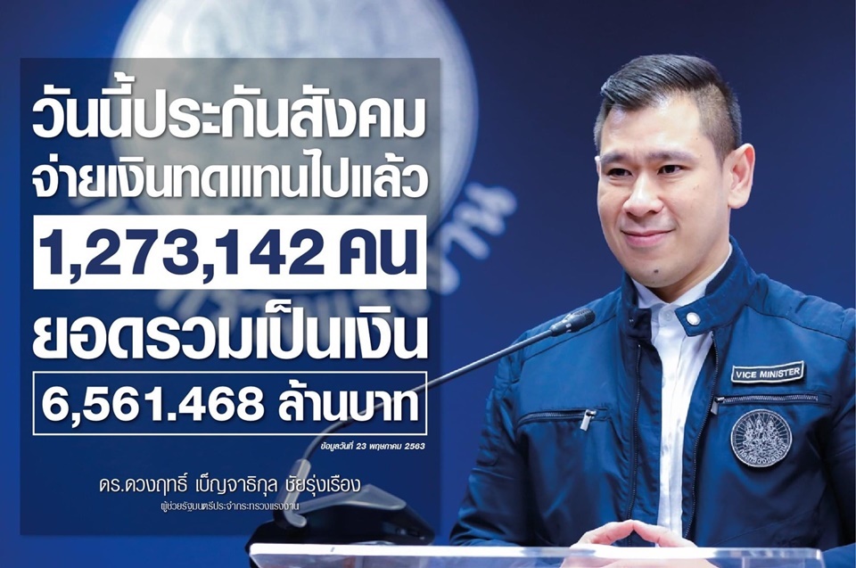 ล่าสุด นายดวงฤทธิ์ เบ็ญจาธิกุล ชัยรุ่งเรือง ผู้ช่วยรัฐมนตรีประจำกระทรวงแรงงาน โพสต์เพจเฟซบุ๊ก “ดร๊าฟ ดวงฤทธิ์” ว่า เมื่อวันที่ 4 พฤษภาคม 2563 ได้เปิดให้ผู้ประกันตนมาตรา 33 ส่งข้อมูลมาทาง Inbox แล้วไปตามเรื่องเงินทดแทนให้กับประกันสังคมทุกจังหวัด จนถึงตอนนี้ประกันสังคมได้อนุมัติจ่ายไปแล้ว 1,273,142 คน ซึ่งส่วนมากได้รับเงินเรียบร้อยแล้ว แต่ถ้ายังคงมีผู้ประกันตนบางคนที่ยังไม่ได้รับเงินเยียวยาจากประกันสังคม ซึ่งไม่นิ่งนอนใจและตอนนี้ที่สำนักงานประกันสังคม ได้เปิดศูนย์อุทธรณ์ ร้องทุกข์ สำหรับผู้ที่ไม่ได้เงินทดแทน