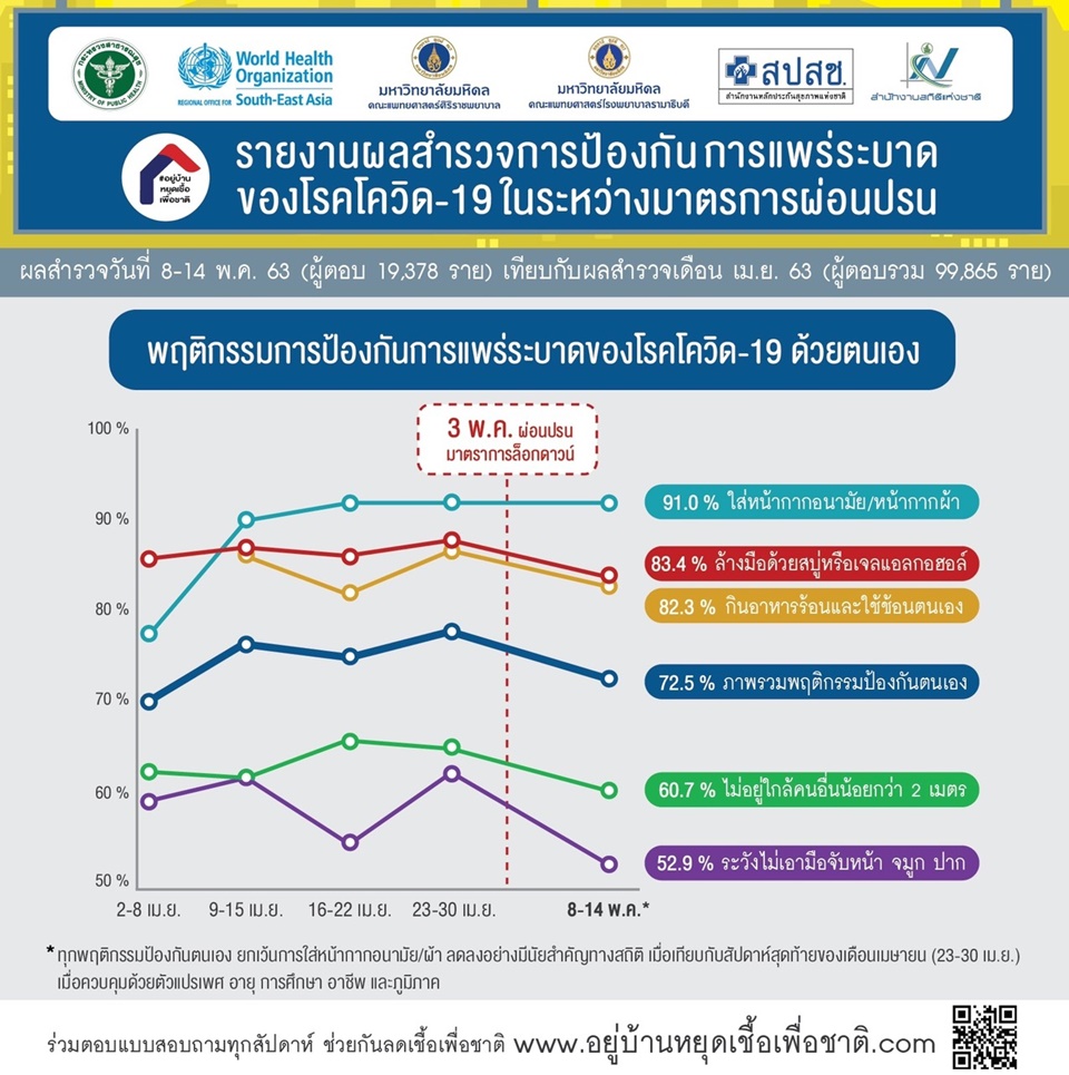 กระทรวงสาธารณสุข โดยสำนักงานพัฒนานโยบายสุขภาพระหว่างประเทศ ร่วมกับองค์การอนามัยโลกสำนักงานภูมิภาคเอเชียตะวันออกเฉียงใต้ คณะแพทยศาสตร์ศิริราชพยาบาล คณะแพทยศาสตร์โรงพยาบาลรามาธิบดี สำนักงานหลักประกันสุขภาพแห่งชาติ (สปสช.) และสำนักงานสถิติแห่งชาติ ทำการสำรวจผลการป้องกันการแพร่ระบาดของโรคโควิด-19 หลังผ่อนปรนมาตรการล็อกดาวน์ระหว่างวันที่ 8-14 พ.ค.63 โดยมีผู้ตอบแบบสำรวจ 19,378 ราย พบว่า นอกเหนือจากการใส่หน้ากากผ้า/หน้ากากอนามัย ซึ่งปฏิบัติตามได้ ร้อยละ 91 เท่ากับช่วงล็อกดาวน์แล้ว พฤติกรรมอื่นๆในการป้องกันตนเองจากโควิด-19ของประชาชนลดลงอย่างมีนัยสำคัญทางสถิติ