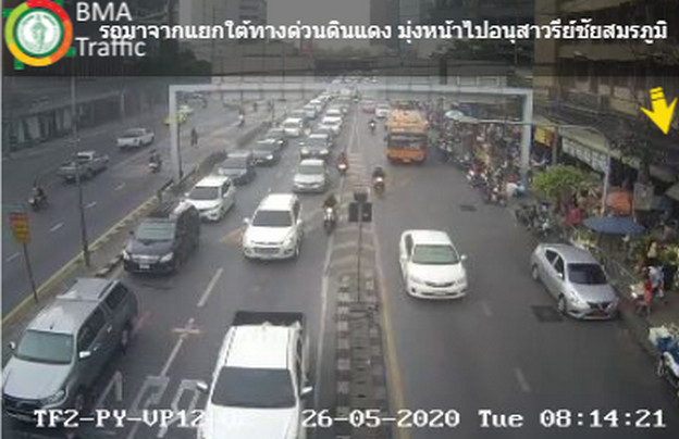 กทม. 26 พ.ค.-สวพ.FM 91 รายงานจราจรเช้าวันอังคาร ถนนดินแดง ขาเข้า จากใต้ด่วนดินแดง มุ่งหน้าอนุสาวรีย์ชัยฯ ติดขัด