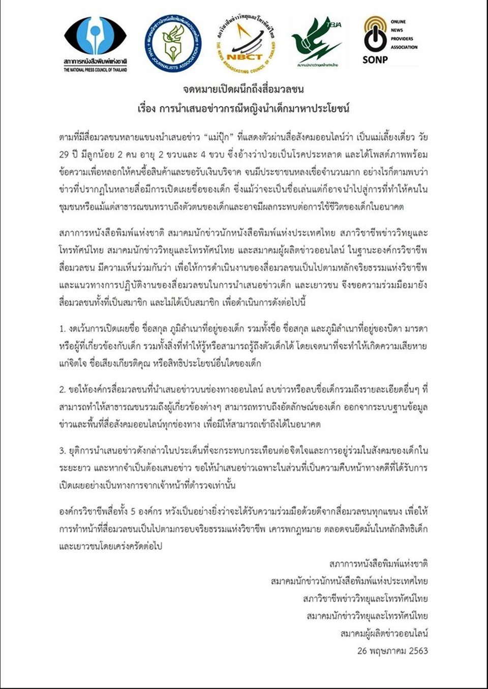 สภาการหนังสือพิมพ์แห่งชาติ สมาคมนักข่าวนักหนังสือพิมพ์แห่งประเทศไทย สภาวิชาชีพข่าววิทยุและโทรทัศน์ไทย สมาคมนักข่าววิทยุและโทรทัศน์ไทย และสมาคมผู้ผลิตข่าวออนไลน์ ในฐานะองค์กรวิชาชีพสื่อมวลชน มีความเห็นร่วมกันว่า เพื่อให้การดำเนินงานของสื่อมวลชนเป็นไปตามหลักจริยธรรมแห่งวิชาชีพ และแนวทางการปฏิบัติงานของสื่อมวลชนในการนำเสนอข่าวเด็ก และเยาวชน จึงขอความร่วมมือมายังสื่อมวลชนทั้งที่เป็นสมาชิก และไม่ได้เป็นสมาชิก เพื่อดำเนินการดังต่อไปนี้
