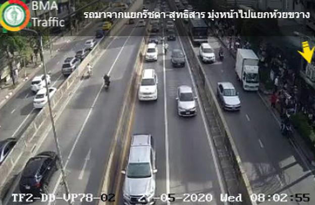 กทม. 27 พ.ค.-สวพ.FM91 รายงานจราจรเช้าวันพุธ ถนนรัชดาภิเษก ขาเข้า จากแยกสุทธิสาร เข้าแยกห้วยขวาง รถมาก ท้ายแถวสะสมอุโมงค์สุทธิสาร