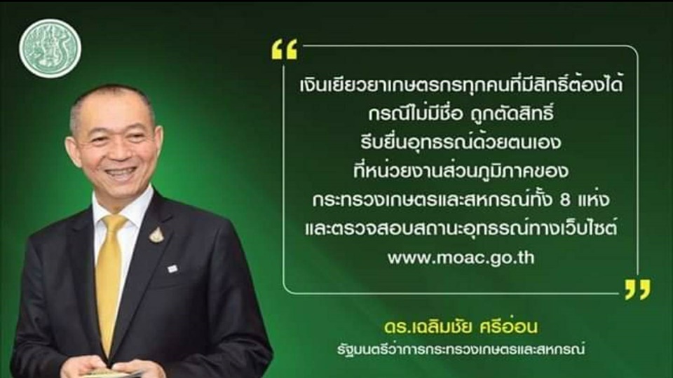 นายเฉลิมชัย ศรีอ่อน รัฐมนตรีว่าการกระทรวงเกษตรและสหกรณ์ กล่าวว่า ได้รับรายงานจากปลัดกระทรวงเกษตรฯ ถึงผลการจ่ายเงินเยียวยาเกษตรกรตั้งแต่วันที่ 15 – 27 พฤษภาคม ว่า จ่ายไปแล้ว 5,720,774 ราย เป็นเงิน 28,603.87 ล้านบาท เกินกว่าร้อยละ 50 ของเกษตรกรเป้าหมายตามโครงการ 10 ล้านรายทั่วประเทศ สำหรับเกษตรกรที่ยังไม่ได้รับเงินตามรอบสามารถอุทธรณ์ได้ทุกกรณีจนถึงวันที่ 5 มิถุนายน ล่าสุดมีผู้อุทธรณ์รวม 20,160 ราย ซึ่งกำชับให้แต่ละหน่วยงานรวบรวมข้อมูลส่งให้คณะกรรมการอุทธรณ์ภายใน 3 วัน ขณะนี้มีเรื่องที่เข้าสู่การพิจารณาของคณะกรรมการอุทธรณ์ 1,567 เรื่อง ซึ่งคณะกรรมการอุทธรณ์ต้องพิจารณาให้เสร็จภายใน 5 วัน เพื่อให้เกษตรกรที่เดือดร้อนอยู่ได้รับความช่วยเหลือเร็วที่สุด