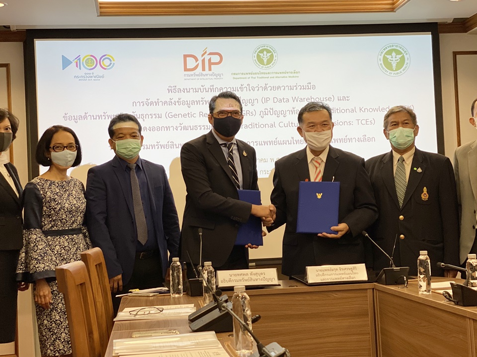 นายทศพล ทังสุบุตร อธิบดีกรมทรัพย์สินทางปัญญา และนายแพทย์มรุต จิรเศรษฐสิริ อธิบดีกรมการแพทย์แผนไทยและการแพทย์ทางเลือกได้ลงนามบันทึกความเข้าใจว่าด้วยความร่วมมือการจัดทำคลังข้อมูลทรัพย์สินทางปัญญา และข้อมูลด้านทรัพยากรพันธุกรรม ภูมิปัญญาท้องถิ่น และการแสดงออกทางวัฒนธรรมดั้งเดิม ซึ่งการลงนามครั้งนี้จะช่วยป้องกันการลักลอบใช้ทรัพยากรพันธุกรรมและภูมิปัญญาท้องถิ่นไทยได้เป็นอย่างดี