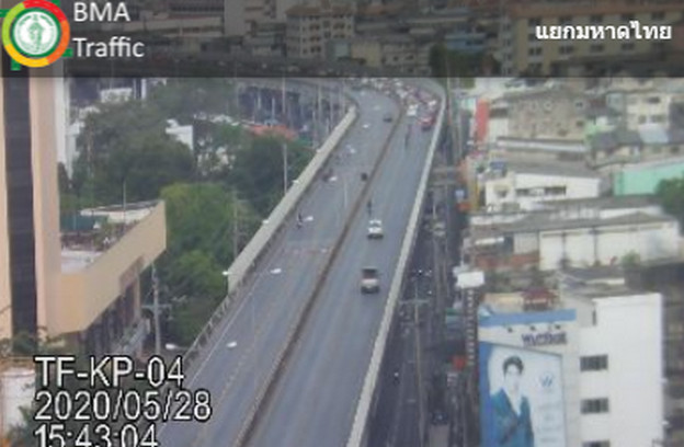 ถนนวิภาวดี-รังสิต ขาเข้า มุ่งหน้าเข้าใต้ทางด่วนดินแดง รถหนาแน่น เคลื่อนตัวได้ช้า ท้ายแถวสะสมอยู่ที่หน้ามหาวิทยาลัยหอการค้าไทย