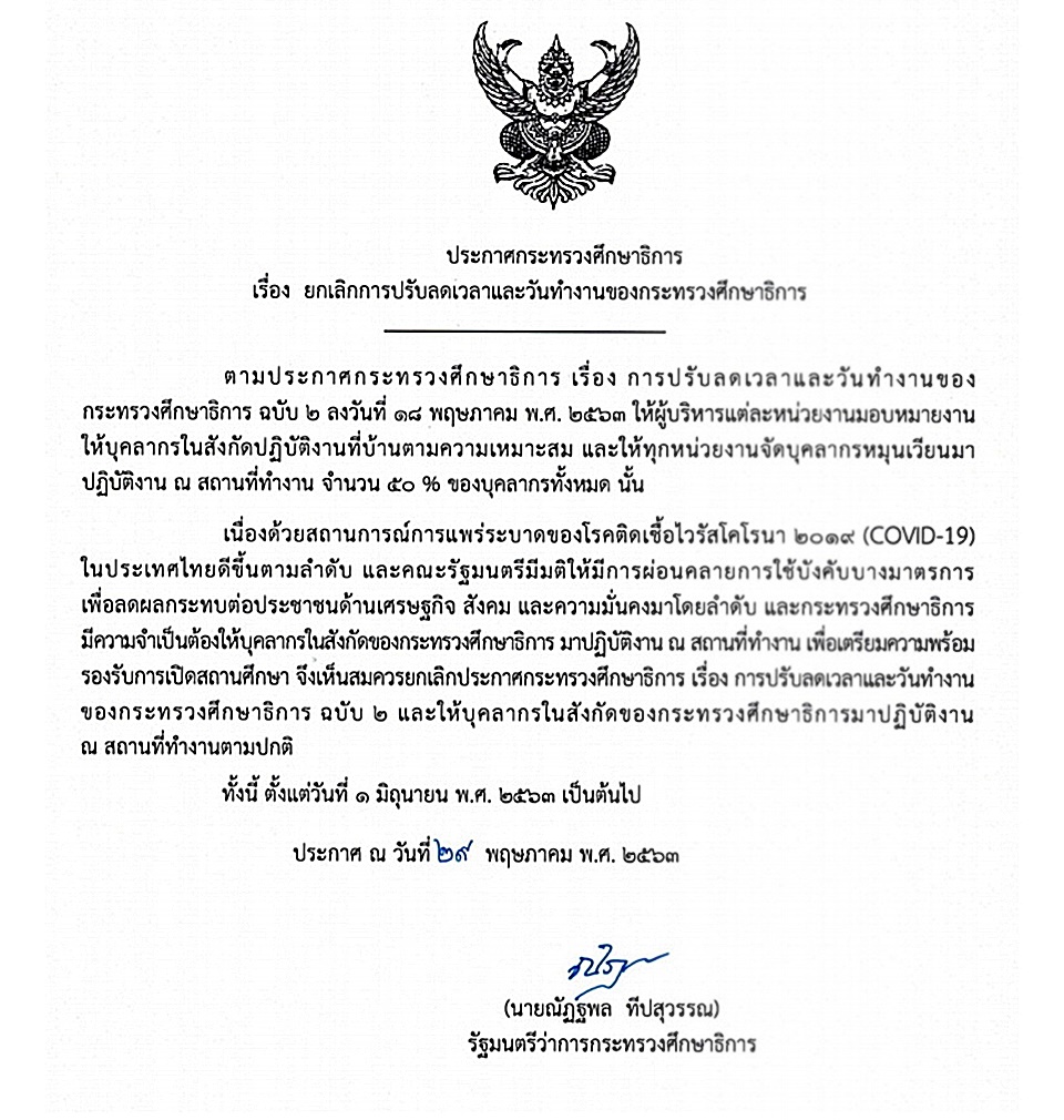 เนื่องด้วยสถานการณ์การแพร่ระบาดของโรคติดเชื้อไวรัสโคโรนา 2019(โควิด-19) ในประเทศไทยดีขึ้นตามลำดับ และคณะรัฐมนตรีมีมติให้มีการผ่อนคลายการใช้บังคับบางมาตรการเพื่อลดผลกระทบต่อประชาชนด้านเศรษฐกิจ สังคมและความมั่นคงมาโดยลำดับ และกระทรวงศึกษาธิการมีความจำเป็นต้องให้บุคลากรในสังกัดกระทรวงศึกษาธิการมาปฏิบัติงาน ณ สถานที่ทำงาน เพื่อเตรียมความพร้อมรองรับการเปิดสถานศึกษา จึงเห็นสมควรยกเลิกประกาศกระทรวงศึกษาธิการ เรื่อง การปรับลดเวลาและวันทำงานของกระทรวงศึกษาธิการ ฉบับ2 และให้บุคลากรในสังกัดของกระทรวงศึกษาธิการมาปฏิบัติงาน ณ สถานที่ทำงานตามปกติ ทั้งนี้ ตั้งแต่วันที่ 1 มิถุนายน พ.ศ.2563 เป็นต้นไป .-สำนักข่าวไทย