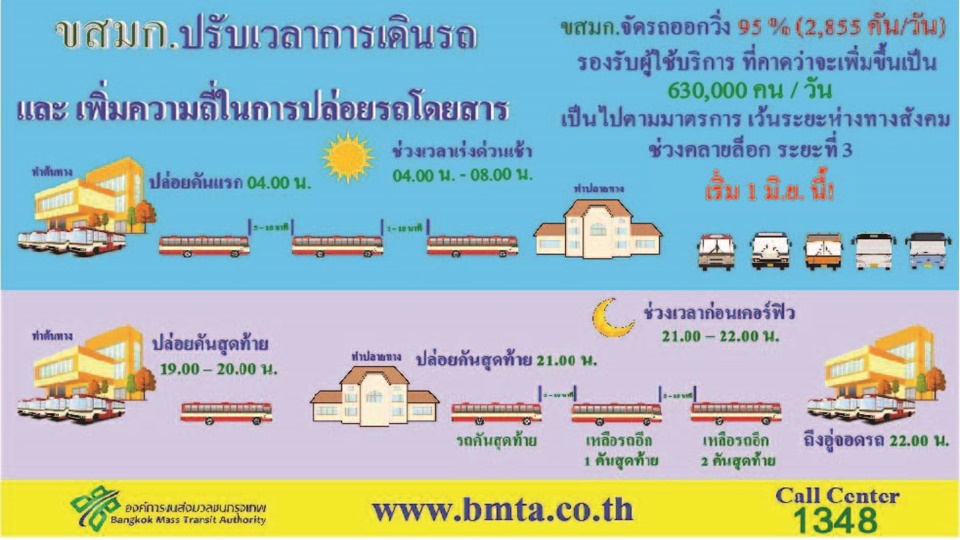 ขสมก.จึงจัดแผนเดินรถโดยสารในช่วงมาตรการคลายล็อกระยะ 3 ดังนี้ 1.จัดรถออกวิ่ง 95 % (2,855 คัน/วัน) หรือจัดรถออกวิ่งให้สอดคล้องกับความต้องการใช้บริการของประชาชนในแต่ละช่วงเวลา 2.ปรับเวลาการให้บริการเดินรถโดยสาร จากเวลา 05.00 – 22.00 น. (เวลา 22.00 น. คือ เวลาที่รถโดยสารกลับถึงอู่จอดรถ) เป็นให้บริการ เวลา 04.00 – 22.00 น.(เวลา 22.00 น. คือเวลาที่รถโดยสารกลับถึงอู่จอดรถ) โดยเพิ่มความถี่ในการปล่อยรถ ช่วงเวลาเร่งด่วนเช้า (04.00 – 08.00 น.) และช่วงเวลาก่อนเคอร์ฟิว (21.00 – 22.00 น.) ให้มีระยะห่างกันไม่เกิน 5 – 10 นาที และ 3.ปล่อยรถโดยสารคันสุดท้าย ออกจากท่าปลายทางประมาณ 21.00 น. เพื่อให้พนักงานสามารถนำรถกลับเข้าอู่จอดรถได้ทันเวลา 22.00 น. โดยปรับเพิ่มความถี่ช่วงการปล่อยรถ 3 คันสุดท้าย ให้มีระยะห่างกัน 5 – 10 นาที ซึ่งรถโดยสาร 3 คันสุดท้ายจะติดป้ายข้อความบ่งชี้บริเวณหน้ารถโดยสาร ดังนี้ เหลือรถ 2 คันสุดท้าย, เหลือรถ 1 คันสุดท้าย และรถคันสุดท้าย