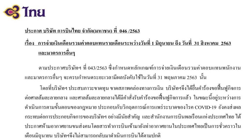 และสำนักงานการบินพลเรือนแห่งประเทศไทยได้ประกาศห้ามอากาศยานขนส่งคนโดยสารทำการบินเข้ามายังท่าอากาศยานในประเทศไทยเป็นการชั่วคราวในเดือนมิถุนายน บริษัทจึงไม่สามารถดำเนินการบินได้ตามปกติ ทำให้จำเป็นต้องควบคุมค่าใช้จ่ายทุกรายการให้ใช้จ่ายได้เท่าที่จำเป็น เพื่อให้การดำเนินการตามขั้นตอนการฟื้นฟูกิจการทำได้สำเร็จ ซึ่งการประชุมบอร์ดนัดพิเศษเมื่อวันที่ 29 พฤษภาคมที่ผ่านมาที่ประชุมได้มีมติอนุมัติการจ่ายเงินเดือนและค่าตอบแทนรายเดือน โดยให้พนักงานสมัครใจตั้งแต่วันที่ 1 มิถุนายนถึง 31 สิงหาคม หากเป็นพนักงานระดับผู้อำนวยการใหญ่หรือกรรมการผู้จัดการบริษัทจะจ่ายเงินเดือนและค่าตอบแทนรายเดือนให้ร้อยละ 60 ระดับรองกรรมการผู้อำนวยการใหญ่บริษัทจ่ายเงินเดือนและค่าตอบแทนรายเดือนให้ร้อยละ 50 ส่วนพนักงานส่วนอื่น ๆ บริษัทจะจ่ายเงินเดือนและค่าตอบแทนรายเดือนในอัตราลดแบบขั้นบันไดตามประกาศของบริษัทฯ