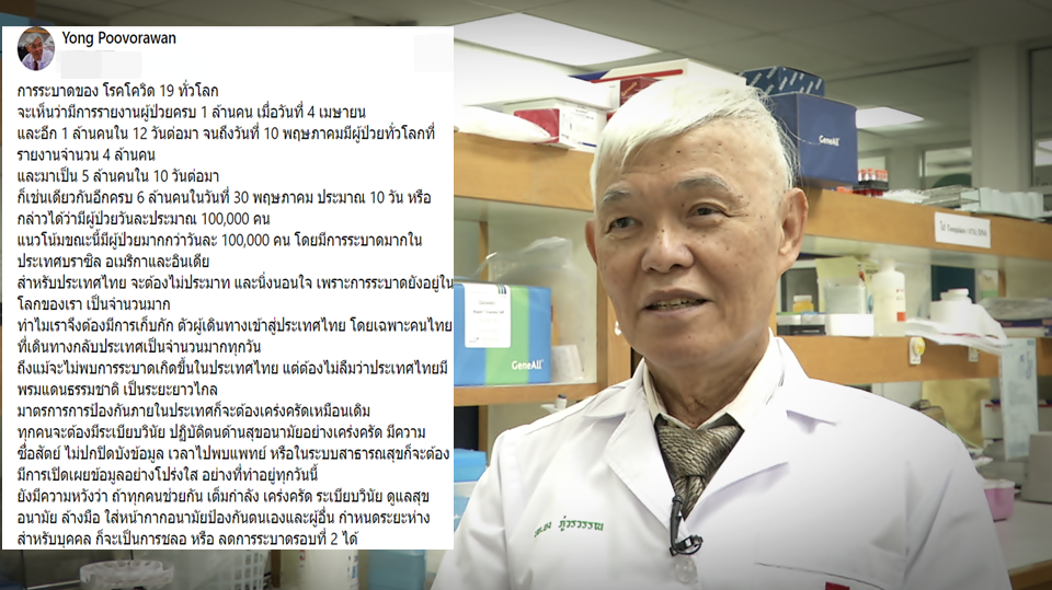 ศ.นพ.ยง ภู่วรวรรณ หัวหน้าศูนย์เชี่ยวชาญเฉพาะทางด้านไวรัสวิทยาคลินิก คณะแพทยศาสตร์ จุฬาลงกรณ์มหาวิทยาลัย โพสต์เฟซบุ๊ก Yong Poovorawan ว่า การระบาดของ โรคโควิด-19 ทั่วโลก จะเห็นว่ามีการรายงานผู้ป่วยครบ 1ล้านคน เมื่อวันที่ 4 เมษายน และอีก 1 ล้านคนใน 12 วันต่อมา จนถึงวันที่ 10 พฤษภาคมมีผู้ป่วยทั่วโลกที่รายงานจำนวน 4 ล้านคน
