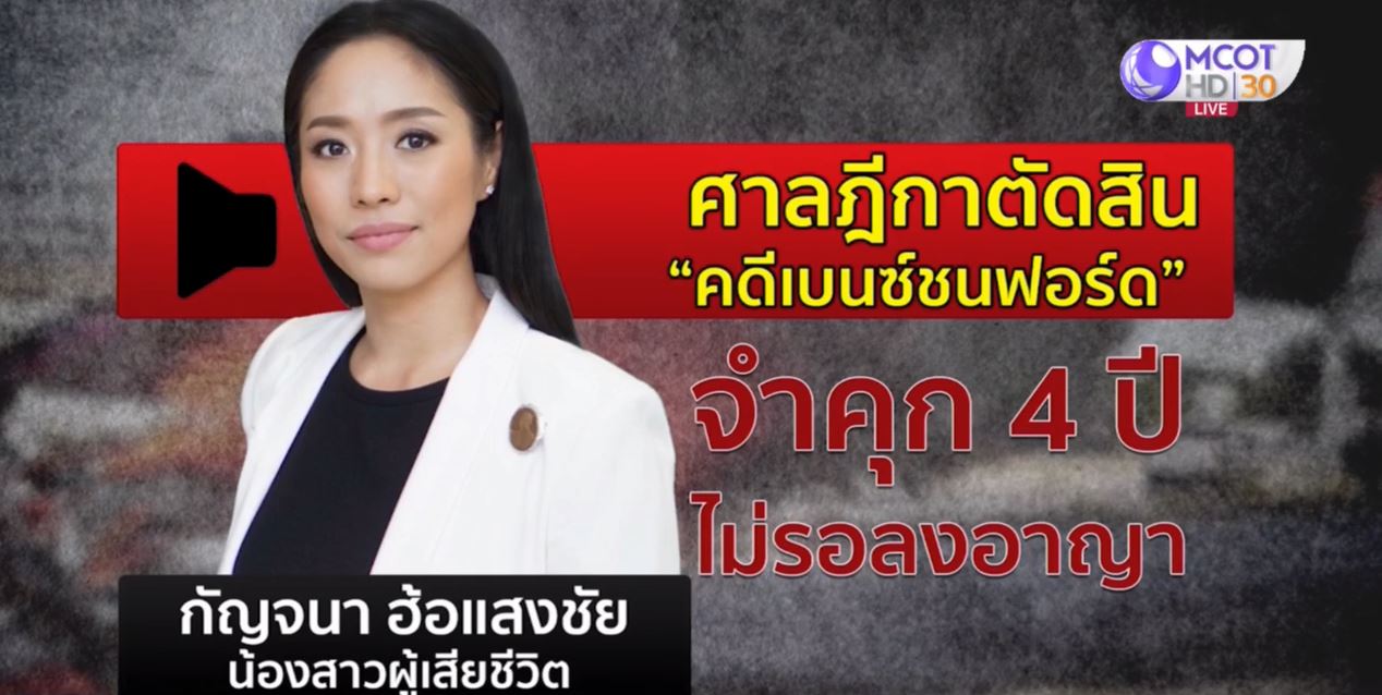 นางสาวกัญจนา ฮ้อแสงชัย น้องสาวของนางสาวธัญฐภัทร์ ผู้เสียชีวิตจากเหตุการณ์ เปิดเผยว่า ทราบคำตัดสินของศาลฎีกาสั่งจำคุกจำเลย 4 ปี นายเจนภพแล้ว พร้อมขอบคุณและเคารพคำตัดสินของศาล ส่วนพิพากษาลงโทษจำคุกเป็นเวลา 4 ปีนั้น ไม่ขอเอาเรื่องระยะเวลามาเปรียบเทียบกับคุณค่าชีวิตที่เสียไป เชื่อว่าคดีนี้จะสร้างบรรทัดฐานให้สังคมไทย เพราะเชื่อมั่นกระบวนการยุติธรรมตั้งแต่ต้นว่าผู้กระทำผิดต้องได้รับโทษ ผลก็ออกมาค่อนข้างชัดเจน