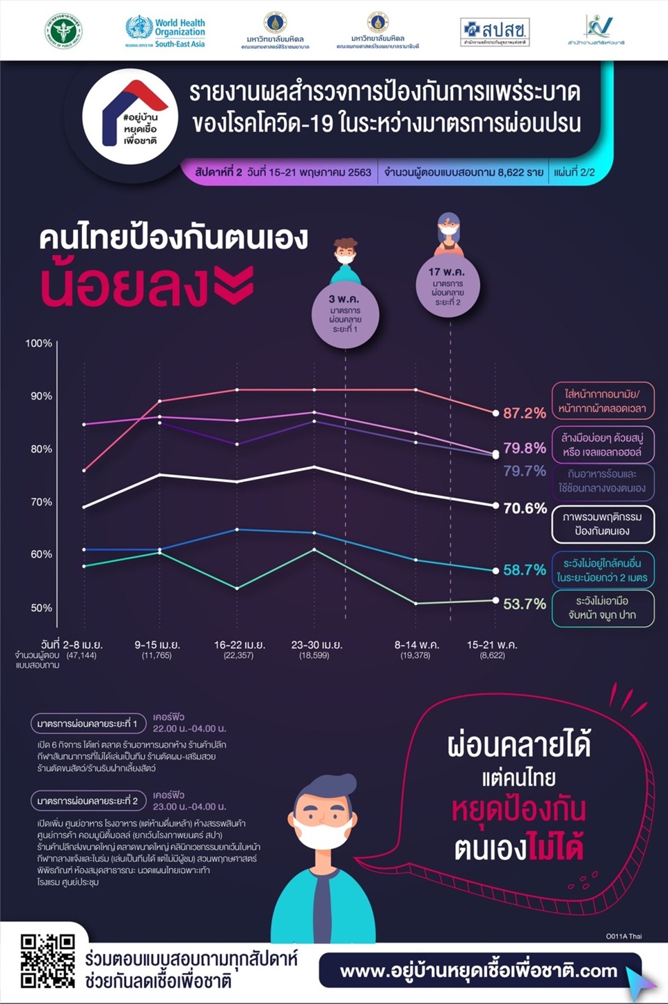 กระทรวงสาธารณสุข โดยสำนักงานพัฒนานโยบายสุขภาพระหว่างประเทศ ร่วมกับองค์การอนามัยโลกสำนักงานภูมิภาคเอเชียตะวันออกเฉียงใต้ คณะแพทยศาสตร์ศิริราชพยาบาล คณะแพทยศาสตร์โรงพยาบาลรามาธิบดี สำนักงานหลักประกันสุขภาพแห่งชาติ และสำนักงานสถิติแห่งชาติ ทำการสำรวจผลการป้องกันการแพร่ระบาดของโรคโควิด-19 หลังผ่อนปรนมาตรการล็อกดาวน์สัปดาห์ที่ 2 ระหว่างวันที่ 15-21 พ.ค. 2563 โดยมีผู้ตอบแบบสำรวจ 8,622 ราย พบว่า คนไทยมีการปฏิบัติตัวเพื่อป้องกันโควิด-19 น้อยลงอย่างต่อเนื่อง