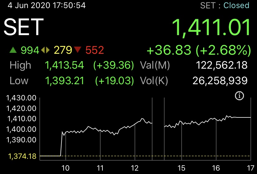 กรุงเทพฯ 4 มิ.ย. – ตลาดหลักทรัพย์ปิดวันนี้ที่ระดับ 1,411.01 จุด เพิ่มขึ้น 36.83 จุด (+2.68%) มูลค่าการซื้อขาย 122,562.18 ล้านบาท ซึ่งมูลค่าซื้อขายขึ้นมาสูงสุดในรอบ 1 ปีเศษ โดยวันที่ 28 พ.ค.62 มีมูลค่าซื้อขาย 204,855.67 ล้านบาท
