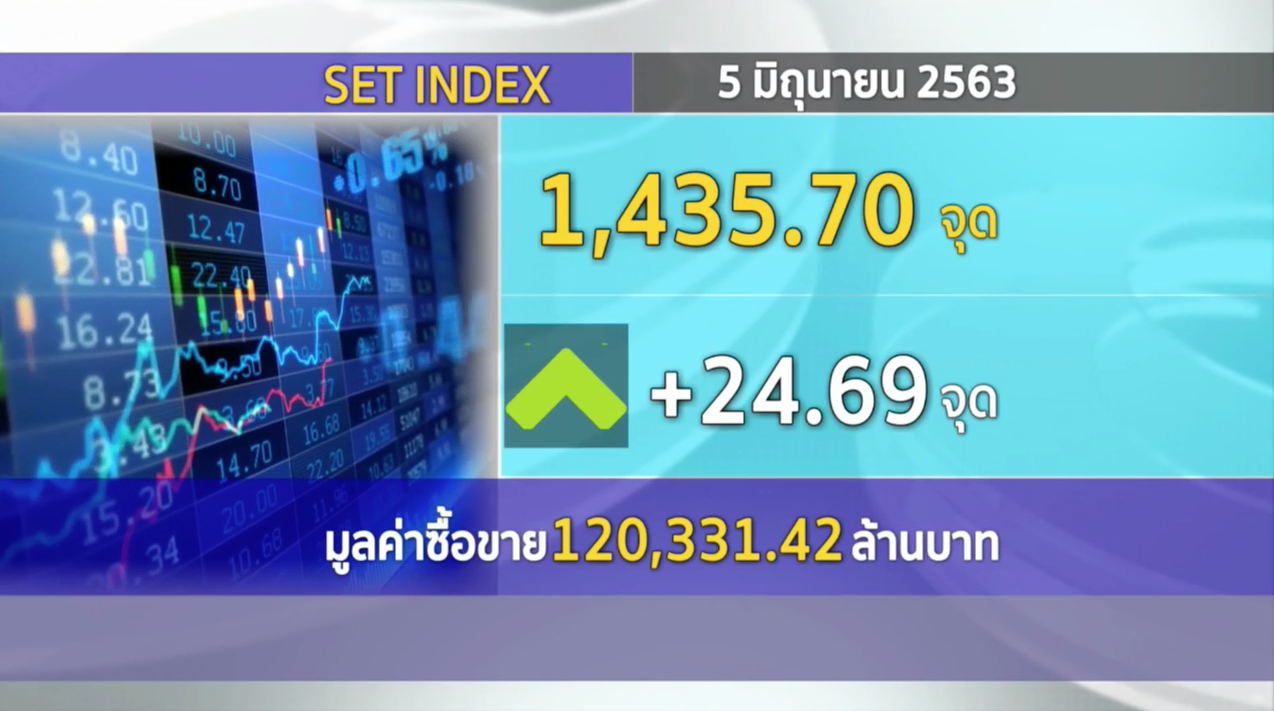 กทม. 5 มิ.ย.- ตลาดหลักทรัพย์ปิดวันนี้ที่ระดับ 1,435.70 จุด เพิ่มขึ้น 24.69 จุด (+1.75%) มูลค่าการซื้อขาย 120,331.42 ล้านบาท.-สำนักข่าวไทย