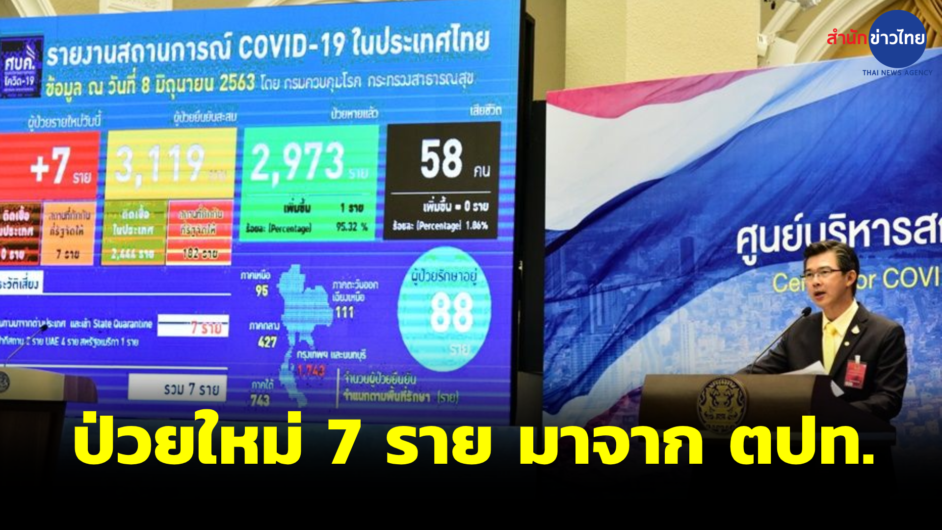 นพ.ทวีศิลป์ วิษณุโยธิน โฆษกศูนย์บริหารสถานการณ์การแพร่ระบาดของโรคติดเชื้อไวรัสโคโรนา 2019 (โควิด-19) หรือ ศบค.แถลงสถานการณ์โควิด-19 ว่า วันนี้ (8 มิ.ย.) ไทยมีรายงานผู้ป่วยใหม่ 7 ราย รวมผู้ป่วยสะสมเป็น 3,119 ราย รักษาหาย 2,973 ราย รักษาอยู่ 88 ราย ไม่มีผู้เสียชีวิตเพิ่ม ทำให้ยอดผู้เสียชีวิตอยู่ที่ 58 ราย