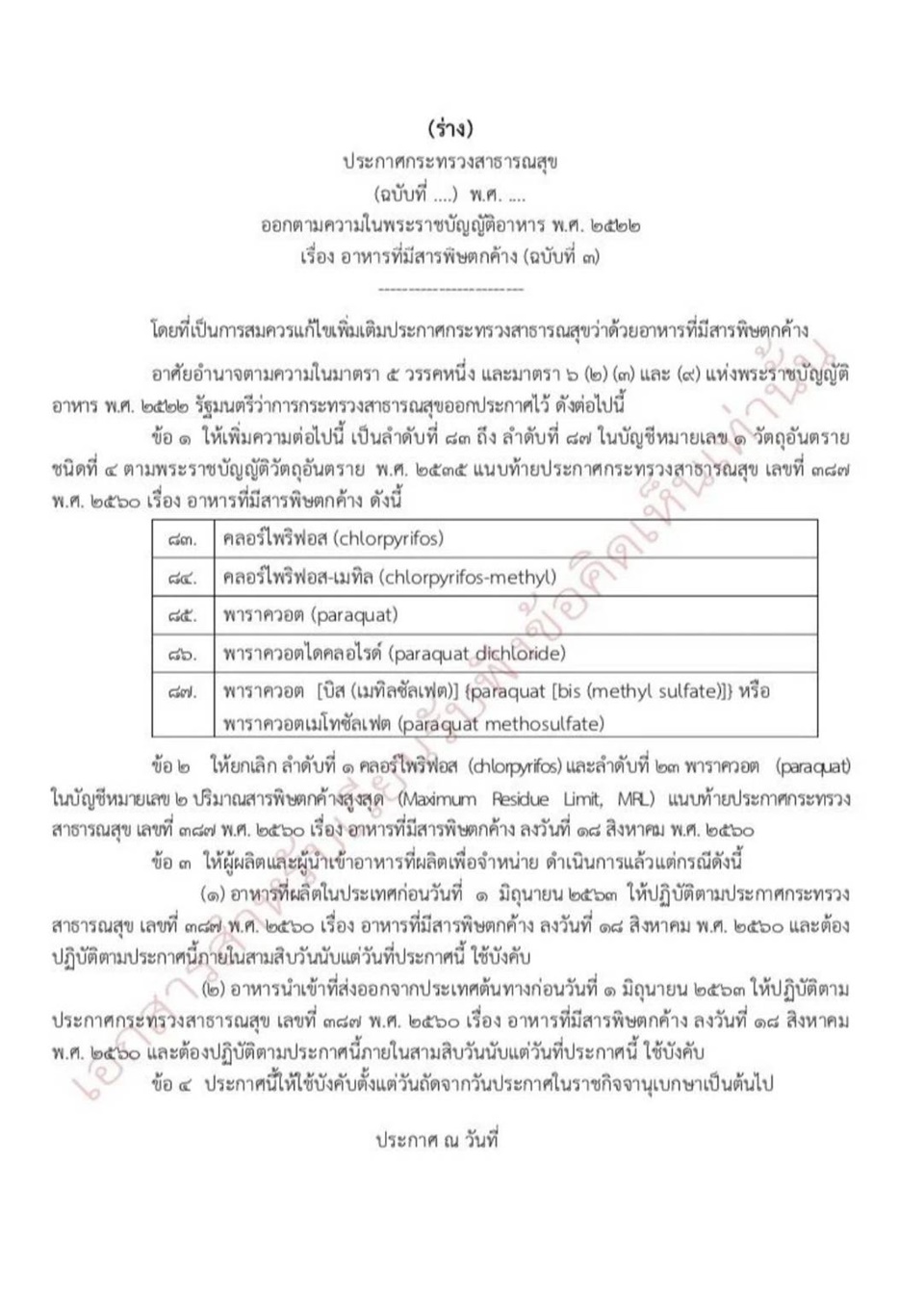 นางสาวมนัญญา ไทยเศรษฐ์ รัฐมนตรีช่วยว่าการกระทรวงเกษตรและสหกรณ์ กล่าวว่า ต้องการให้ผู้มีส่วนเกี่ยวข้อง ได้แก่ หน่วยงานภาครัฐ ผู้นำเข้าผลิตผลทางการเกษตรเพื่อใช้เป็นอาหาร ผู้นำเข้า/ผู้ผลิตอาหารสำเร็จรูป เป็นต้น ร่วมกันแสดงความเห็นต่อ (ร่าง) ประกาศกระทรวงสาธารณสุข (ฉบับที่ ….) พ.ศ….. ออกตามความในพระราชบัญญัติอาหาร พ.ศ. 2563 เรื่อง อาหารที่มีสารพิษตกค้าง (ฉบับที่ 3) ว่า เห็นด้วยกับการเพิ่มรายชื่อวัตถุอันตรายทางการเกษตร 2 ชนิด คือ พาราคอวตและคลอร์ไพรอฟอสแนบท้ายประกาศกระทรวงสาธารณสุขหรือไม่ หากไม่เห็นด้วยเพราะเหตุใด รวมทั้งการยกเลิกปริมาณสารพิษตกค้างสูงสุด (MRL) ของ 2 สารนี้นั่นคือ การให้ค่าตกค้างของสารพิษดังกล่าวในอาหารเป็นศูนย์ (Zero Terroance)