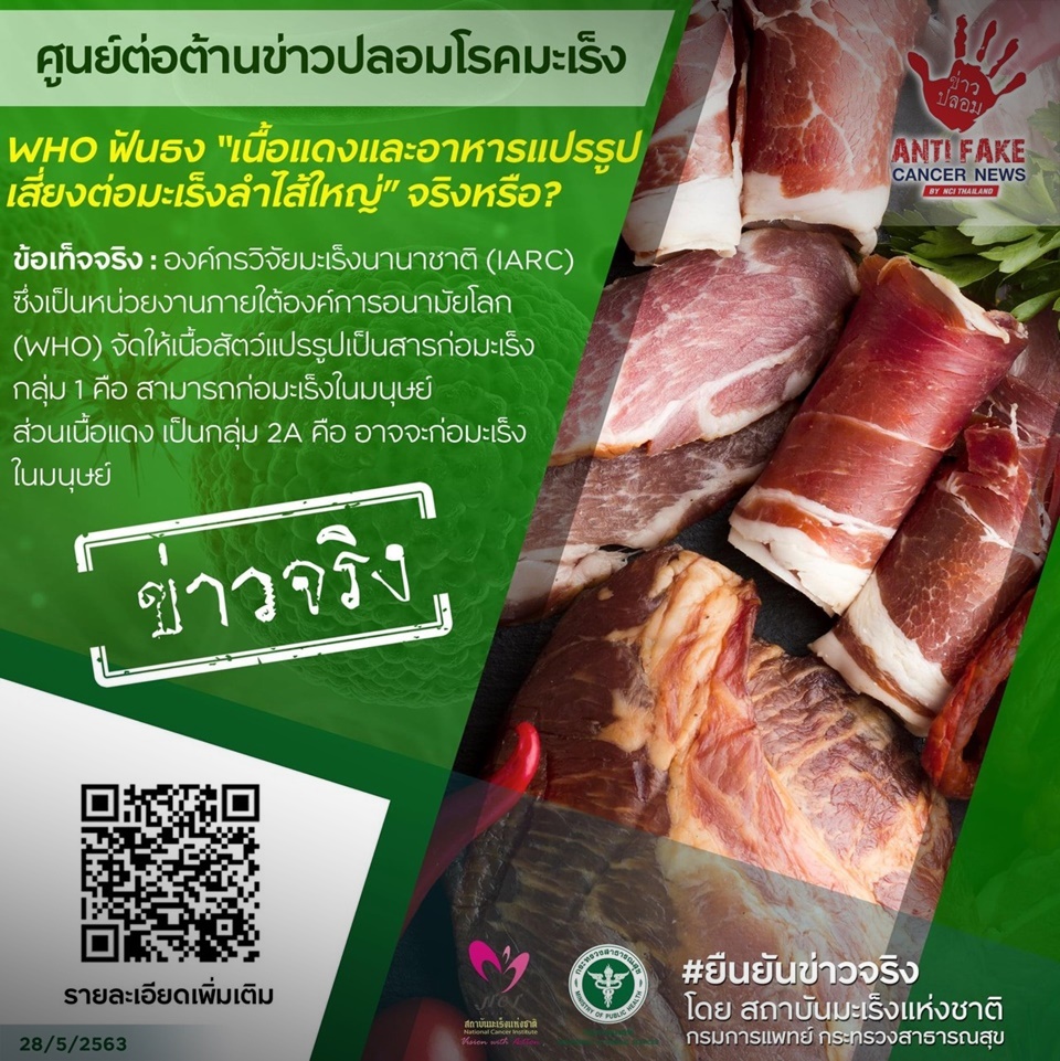 เพจเฟซบุ๊ก กรมการแพทย์ โพสต์วันนี้(10มิ.ย.) ว่า ตามที่มีข่าวปรากฏตามสื่อต่าง ๆ เกี่ยวกับประเด็น “WHO ฟันธง การรับประทานเนื้อแดงและอาหารแปรรูป เสี่ยงมะเร็งลำไส้ใหญ่”นั้น กรมการแพทย์ โดยสถาบันมะเร็งแห่งชาติ ได้ตรวจสอบข้อมูลวิชาการพบข้อเท็จจริง คือองค์กรวิจัยมะเร็งนานาชาติ หรือ International Agency for Research on Cancer (IARC) ซึ่งเป็นหน่วยงานภายใต้องค์การอนามัยโลก(WHO) จัดให้ เนื้อสัตว์แปรรูปเป็นสารก่อมะเร็งกลุ่ม 1 คือสามารถก่อมะเร็งในมนุษย์ ส่วนเนื้อแดง เป็นกลุ่ม 2A คือ อาจจะก่อมะเร็งในมนุษย์