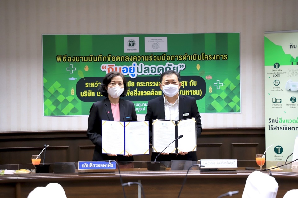 พญ.พรรณพิมล วิปุลากร อธิบดีกรมอนามัย กระทรวงสาธารณสุข (สธ.)เปิดเผยภายหลังพิธีลงนามบันทึกข้อตกลงความร่วมมือการดำเนินโครงการ “กินอยู่ปลอดภัย” ระหว่างกรมอนามัย ร่วมกับบริษัท บรรจุภัณฑ์เพื่อสิ่งแวดล้อม จำกัด(มหาชน) ว่า จากมาตรการผ่อนปรนสถานประกอบกิจการประเภทต่างๆ ของศูนย์บริหารสถานการณ์การแพร่ระบาดของโรคโควิด-19 หรือ ศบค.หนึ่งในนั้น คือสถานประกอบการประเภทร้านอาหาร รถเข็น หาบเร่ แผงลอย ที่ต้องคุมเข้มด้านความสะอาด ปลอดภัย และปฏิบัติตามแนวทางมาตรการป้องกันการแพร่ระบาดของโรคอย่างเคร่งครัดเพราะสถานที่จำหน่ายอาหารเป็นสถานที่ที่มีคนมาจากหลากหลายพื้นที่และมีความเสี่ยงการปนเปื้อนเชื้อโรค โดยที่ผ่านมาตามมาตรการของ ศบค.กำหนดให้ร้านอาหารต่างๆ จำหน่ายอาหารแบบซื้อกลับบ้าน เพื่อป้องกันการรวมตัวและลดความแออัด อย่างไรก็ตามพบว่าสถานที่จำหน่ายอาหารรูปแบบเดลิเวอรีในช่วงนี้ ส่งผลให้เกิดปริมาณขยะเพิ่มขึ้น โดยเฉพาะขยะพลาสติก เช่น กล่องพลาสติกใส่อาหาร ช้อน ส้อม แก้ว หลอดดูด มีปริมาณเพิ่มขึ้นเป็น 6,300 ตันต่อวัน เฉพาะในเขตกรุงเทพมหานคร ประมาณ 1,500 ตันต่อวัน