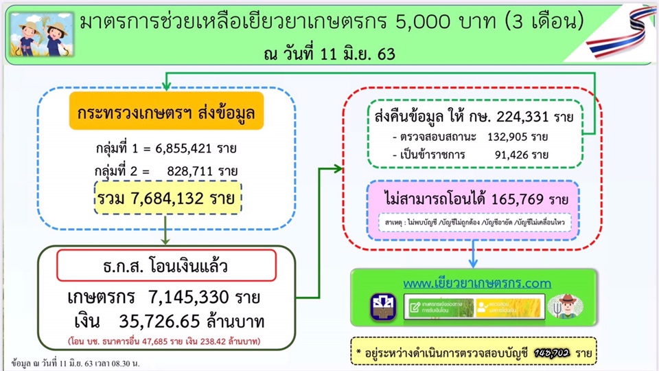 นายกษาปณ์ เงินรวง รองผู้จัดการ ธนาคารเพื่อการเกษตรและสหกรณ์การเกษตร (ธ.ก. ส.) กล่าวถึงผลการจ่ายเงินเยียวยาเกษตรกรกรงวดที่ 1 ของเดือนพฤษภาคมว่า กระทรวงเกษตรและสหกรณ์ส่งรายชื่อมา 7,684,132 ราย โอนเงินสำเร็จแล้ว 7,145,330 ราย เป็นเงินกว่า 35 ล้านบาท