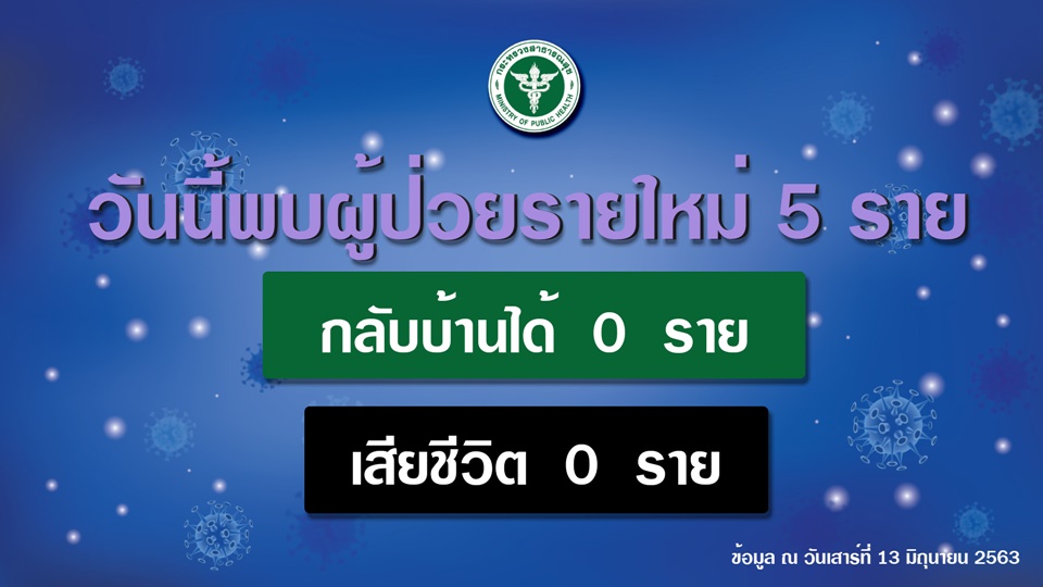 กระทรวงสาธารณสุข (สธ.) รายงานข่าวกรณีโรคติดเชื้อไวรัสโคโรนา 2019 (COVID-19) ประจำวันนี้(13 มิ.ย.) ว่า สถานการณ์ผู้ติดเชื้อไวรัสโคโรนา 2019 ในประเทศไทยวันนี้ มีผู้ติดเชื้อรายใหม่ 5 ราย คัดกรองจากด่านควบคุมโรคติดต่อระหว่างประเทศ ไม่มีผู้ป่วยกลับบ้าน ยอดผู้ป่วยกลับบ้าน สะสม 2,987 ราย หรือคิดเป็นร้อยละ 95.31 ของผู้ป่วยทั้งหมด มีผู้ป่วยที่ยังรักษาอยู่ในโรงพยาบาล 89 ราย หรือร้อยละ 2.84 ของผู้ป่วยทั้งหมด ไม่มีผู้เสียชีวิตเพิ่ม รวมผู้เสียชีวิตสะสม 58 ราย ผู้ป่วยสะสมทั้งสิ้น 3,134 ราย