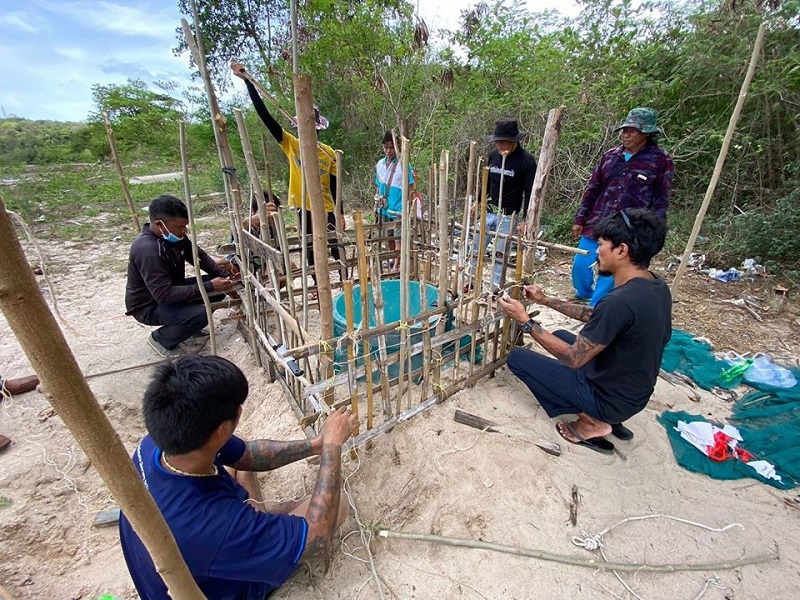 นายปราโมทย์ ชุ่มเชื้อ ผู้ใหญ่บ้าน หมู่ 3 ต.แม่รำพึง อ.บางสะพาน จ.ประจวบคีรีขันธ์ พร้อมผู้ช่วยผู้ใหญ่บ้าน ชาวประมงพื้นบ้าน และชาวบ้านในชุมชนช่วยกันดูแลกั้นคอกล้อมบริเวณหลุมไข่เต่าชายหาดบ้านอ่าวเทียน ใกล้ท่าเรือน้ำลึกบางสะพาน เพื่อป้องกันการรบกวน หลังพบว่าแม่เต่าตนุ อายุประมาณ 10 ปี ขึ้นมาวางไข่ 80 ฟอง