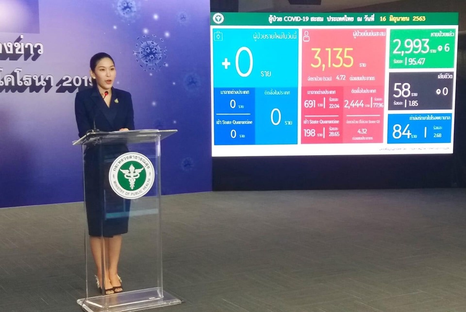 พญ.พรรณประภา ยงค์ตระกูล ผู้ช่วยโฆษกศูนย์บริหารสถานการณ์โควิด-19 (ศบค) แถลงข่าว ศบค.ประจำวันที่ 16 มิถุนายน 2563 ว่า วันนี้ไม่มีผู้ป่วยติดเชื้อรายใหม่ และไม่มีผู้ป่วยเสียชีวิตแต่มีจำนวนรักษาตัวหายแล้วเพิ่ม 6 คน เหลือรักษาตัวในโรงพยาบาล 84 คน ทำให้มียอดผู้ป่วยสะสมรวม 3,135 คน เป็นการติดเชื้อในประเทศ. 2,444 คน และติดเชื้อจากต่างประเทศ พักใน state quarantine 198 คน โดยพบผู้ป่วยมากที่สุด ใน กทม. รองลงมา ปริมาณฑล และ ภาคใต้ ส่วนกลุ่มคนไทยที่กลับมาแล้วพบอาการป่วยใน state quarantine ส่วนใหญ่กลับมาจากประเทศคูเวต 17 คน รองลงมา ซาอุดิอาระเบีย และ ปากีสถาน