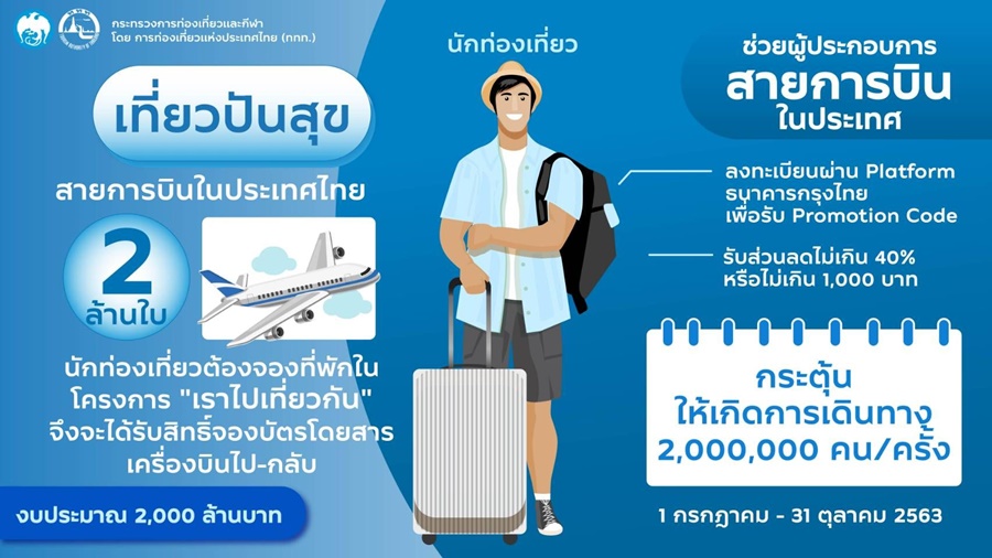 3. “เที่ยวปันสุข” ช่วยเหลือสายการบินต้นทุนต่ำ รถเช่า ซึ่งการดำเนินการจะคล้ายกับแพคเกจเราไปเที่ยวกัน เป็นโครงการระบบร่วมกันจ่ายระหว่างนักท่องเที่ยวและรัฐบาล โดยผู้ใช้บริการออกค่าตั๋ว 60% รัฐสนับสนุนค่าใช้จ่ายเดินทางอัตรา 40% แต่ไม่เกิน 1,000 บาท ส่วนสายการบินที่ร่วมโครงการให้กำหนดราคาตั๋วไป-กลับในประเทศ ในราคา 2,500 บาท.-สำนักข่าวไทย