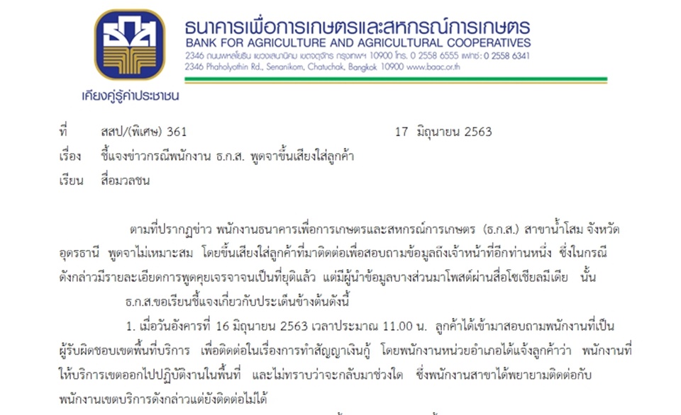 กรุงเทพฯ 17 มิ.ย. – ธ.ก.ส.ชี้แจงเหตุพนักงานขึ้นเสียงใส่ลูกค้า สั่งสอบ พร้อมคาดโทษทางวินัย