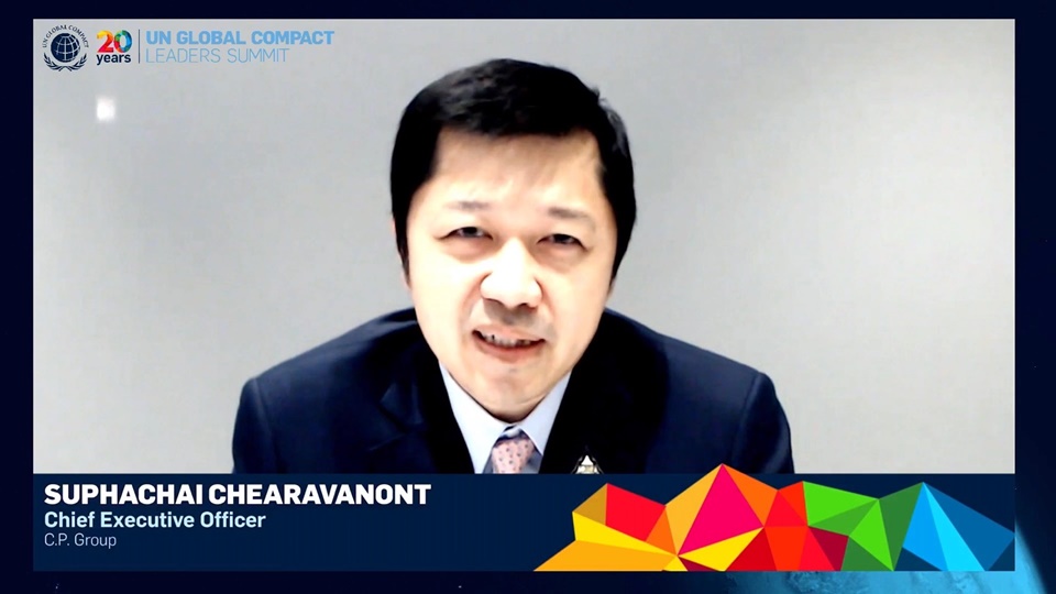 นายศุภชัย เจียรวนนท์ ประธานคณะผู้บริหารเครือเจริญโภคภัณฑ์ และนายกสมาคมเครือข่ายโกลบอลคอมแพ็กแห่งประเทศไทย ร่วมงานเวทีระดับโลก ในหัวข้อ “การทบทวนความเปลี่ยนแปลงที่เกิดขึ้นพร้อมปูทางสู่การฟื้นตัว” บนเวทีผู้นำด้านความยั่งยืนระดับโลก “UN Global Compact Virtual Leaders Summit 2020” จัดขึ้นในโอกาสครบรอบ 20 ปี UN Global Compact ซึ่งรวบรวมสุดยอดผู้นำระดับโลกกว่า 200 คน ร่วมแบ่งปันวิสัยทัศน์และมุมมองธุรกิจบนรากฐานของความยั่งยืนให้ฟื้นตัวได้อย่างแข็งแกร่งจากวิกฤติโควิด-19 ภายใต้แนวคิด “Recover Better, Recover Stronger, Recover Together” โดยมีผู้สนใจลงทะเบียนเข้าร่วมงานผ่านรูปแบบออนไลน์ Virtual Meeting กว่า 15,000 คน จาก 193 ประเทศทั่วโลก