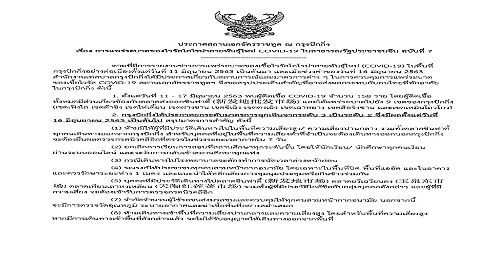 กรุงเทพ ฯ 18 มิ.ย.-สถานทูตไทยฯ ประกาศเตือนคนไทยในกรุงปักกิ่ง ติดตามข่าวสารใกล้ชิด เพิ่มความระมัดระวัง ปฏิบัติตามคำแนะนำทางการเคร่งครัด หลังโควิด-19 ระบาดอีกรอบ