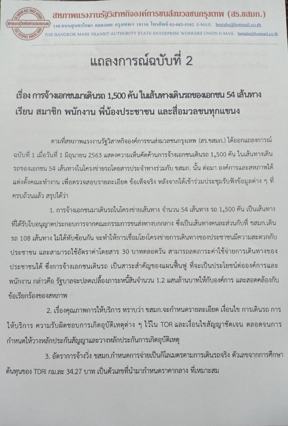 สหภาพแรงงานรัฐวิสาหกิจองค์การขนส่งมวลขนกรุงเทพ (สร.ขสมก.) ได้ออกเอกสารชี้แจงระบุ ว่า สร.ขสมก.ได้เคยออกแถลงการณ์ฉบับที่ 2 เรื่อง การจ้างเอกชนมาเดินรถ 1,500 คัน ในเส้นทางเดินรถของเอกชน 54 เส้นทาง โดยแจ้งว่า ตามที่ สร.ขสมก. ได้ออกแถลงการณ์ ฉบับที่ 1 เมื่อวันที่ 1 มิถุนายน 63 แสดงความเห็นคัดค้านการจ้างเอกชนเดินรถ 1,500 คัน ในเส้นทางเดินรถของเอกชน 54 เส้นทางในโครงข่ายรถโดยสารประจำทางร่วมกับ ขสมก. นั้น ต่อมา ขสมก. และสหภาพ ขสมก. ได้แต่งตั้งคณะทำงาน เพื่อตรวจสอบรายละเอียด ข้อเท็จจริง ครบถ้วนแล้วทางสหภาพ ขสมก.จึงมีข้อสรุปว่า