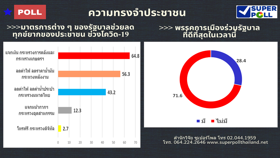 กรุงเทพฯ 20 มิ.ย.-“ซูปเปอร์โพล”เผยประชาชนเชื่อมั่นศรัทธารัฐบาลเพิ่มขึ้น ชอบมาตรการกระทรวงการคลังและกระทรวงเกษตรและสหกรณ์ แจกเงินเยียวยาให้ประชาชน