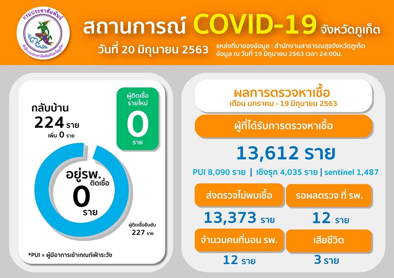 นพ.ธนิศ เสริมแก้ว นายแพทย์สาธารณสุขจังหวัดภูเก็ต รายงานสถานการณ์การแพร่ระบาดของไวรัสโคโรนา หรือโควิด-19 ในพื้นที่จังหวัดภูเก็ตว่า พรุ่งนี้ (21 มิ.ย.) จะครบ 28 วัน ที่ภูเก็ตไม่พบผู้ติดเชื้อ ทำให้จังหวัดภูเก็ตถูกปรับจากการอยู่ในพื้นที่สีเหลืองมาเป็นสีเขียว ซึ่งเป็นพื้นที่ปลอดภัย อย่างไรก็ตาม ยังมีความจำเป็นต้องเฝ้าระวังกลุ่มที่เข้าข่ายเสี่ยงต่อการติดเชื้อ (pui) นอกจากนี้ สาธารณสุขจังหวัดและโรงพยาบาลต่าง ๆ ได้ตรวจหาเชื้อผู้ต้องสงสัยโดยการตรวจจากน้ำลายแทนการเก็บสารคัดหลั่ง 1,400 ราย ไม่พบผู้ติดเชื้อ ทำให้จนถึงวันนี้ภูเก็ตมีผู้ติดเชื้อยืนยันสะสมอยู่ในระบบ คงเดิมที่ 227 ราย