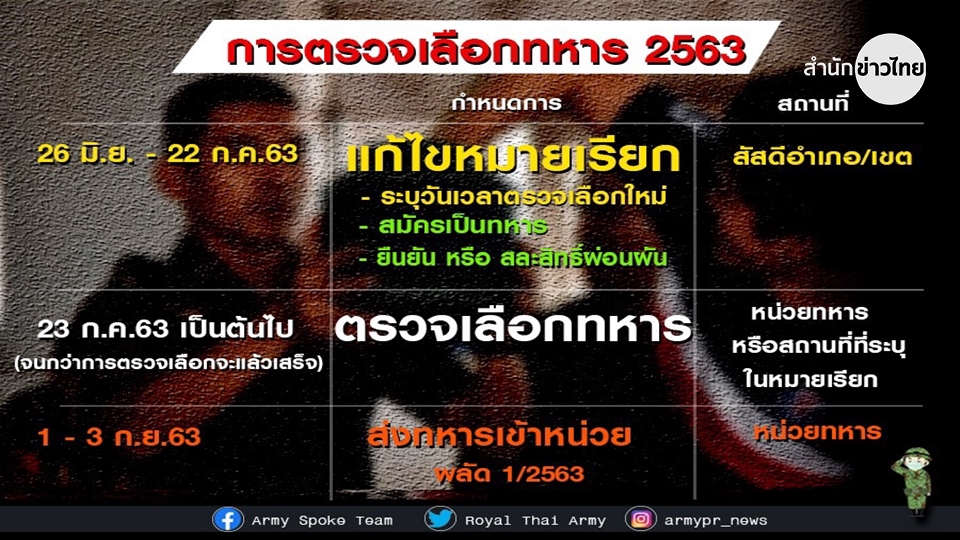 กรุงเทพ 20 มิ.ย.-กองทัพบกเตรียมตรวจเลือกทหารปี63 เน้น Social Distancing ป้อง COVID-19 แจ้งเตือนผู้ที่เข้ารับการตรวจเลือกทหารในปีนี้ทุกคน ต้องไปแก้ไขหมายเรียกใหม่ เริ่ม 26 มิ.ย. – 22 กรกฎาคมนี้ “หน้าที่ชายไทย พร้อมใจไปตรวจเลือก”