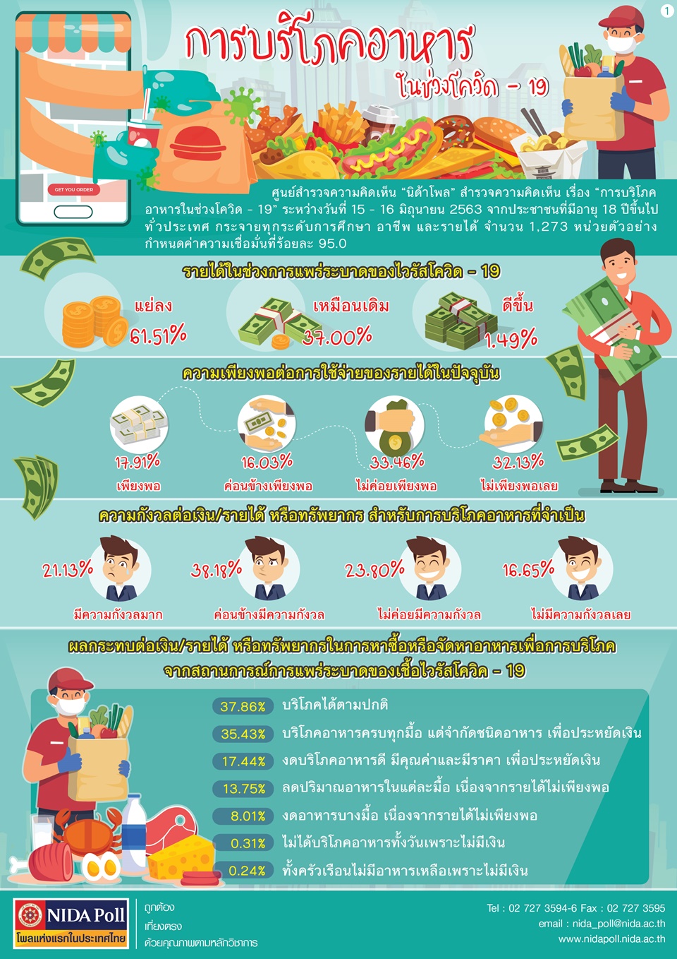 ศูนย์สำรวจความคิดเห็น “นิด้าโพล” สถาบันบัณฑิตพัฒนบริหารศาสตร์ (นิด้า) เปิดเผยผลสำรวจประชาชน เรื่อง “การบริโภคอาหารในช่วงโควิด-19” ซึ่งทำการสำรวจระหว่างวันที่ 15–16 มิ.ย.63 โดยการสัมภาษณ์ทางโทรศัพท์จากประชาชนที่มีอายุ 18 ปีขึ้นไป กระจายทุกภูมิภาค ระดับการศึกษา และอาชีพทั่วประเทศ รวมทั้งสิ้น 1,273 หน่วยตัวอย่าง