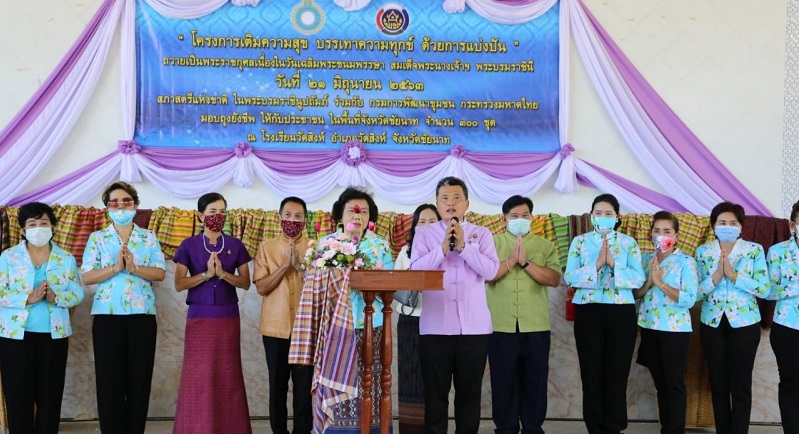 จากนั้น อธิบดีกรมการพัฒนาชุมชน ประธานสภาสตรีแห่งชาติฯ และคณะ ได้เดินทางต่อไปยัง โรงเรียนวัดสิงห์ อ.วัดสิงห์ จ.ชัยนาท เพื่อมอบถุงยังชีพจำนวน 300 ชุด ให้แก่ประชาชนชาวจังหวัดชัยนาท ที่ได้รับผลกระทบจากไวรัสโควิด-19 ตามโครงการ “เติมความสุข บรรเทาความทุกข์ ด้วยการแบ่งปัน” ถวายเป็นพระราชกุศลเนื่องในวันคล้ายวันพระราชสมภพ สมเด็จพระนางเจ้าสุทิดา พัชรสุธาพิมลลักษณ พระบรมราชินี 3 มิถุนายน 2563 โดยมีนายนที มนตริวัต และนายวีระศักดิ์ ศรีโสภา รองผู้ว่าราชการจังหวัดชัยนาท นางบำเพ็ญ ศรีโสภา รองนายกเหล่ากาชาดจังหวัดชัยนาท นางเสริมศรี ศรีวงษ์ญาติดี รองนายก อบจ. ชัยนาท นายวัฒนา เดียวสุรินทร์ พัฒนาการจังหวัดชัยนาท นายยุทธนา แรกขึ้น นายอำเภอวัดสิงห์ นายรชต ปานสมบูรณ์ ผอ.รร. วัดสิงห์ นางนภัสกรณ์ ธูปแก้ว ประธานคณะกรรมการพัฒนาสตรี จ.ชัยนาท ผู้แทนจากภาครัฐ เอกชน ร่วมต้อนรับ