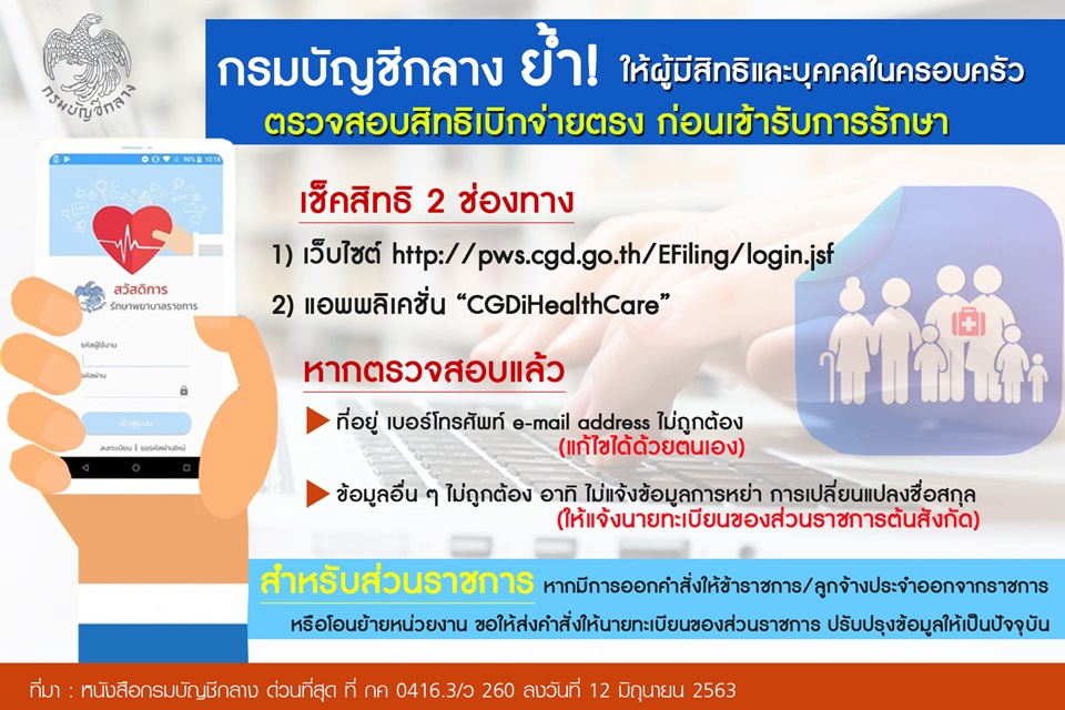 “ขอย้ำให้ผู้มีสิทธิ์ตรวจสอบข้อมูลของตนเองและบุคคลในครอบครัว ก่อนเข้ารับการรักษาที่สถานพยาบาล อย่างสม่ำเสมอ เพื่อลดผลกระทบที่อาจเกิดจากการไม่พบสิทธิ์ในระบบ โดยสามารถตรวจสอบสิทธิ์ได้จาก 2 ช่องทาง คือ แอปพลิเคชั่น “CGDiHealthCare” สามารถดาวน์โหลดแอพพลิเคชั่นบน App Store หรือ Google Play หรือเว็บไซต์ http://pws.cgd.go.th/EFiling/login.jsf โดยลงทะเบียนในระบบการยื่นขอรับบำเหน็จบำนาญด้วยตนเองทางอิเล็กทรอนิกส์ หากผู้มีสิทธิ์ตรวจสอบแล้วพบว่าข้อมูล ที่อยู่ เบอร์โทรศัพท์ หรือ e-mail address ไม่ถูกต้อง ผู้มีสิทธิ์สามารถปรับปรุง แก้ไข ได้ด้วยตนเอง หากเป็นการแจ้งข้อมูลการจดทะเบียนหย่า หรือมีการเปลี่ยนแปลงชื่อ สกุล ขอให้แจ้งนายทะเบียนต้นสังกัด เพื่อปรับปรุงข้อมูลให้ถูกต้องเป็นปัจจุบัน ซึ่งกรมบัญชีกลางได้กำหนดรอบประมวลผลการขึ้นสิทธิสวัสดิการรักษาพยาบาลข้าราชการในวันที่ 4 และ 19 ของทุกเดือน ทั้งนี้ สามารถสอบถามรายละเอียดเพิ่มเติมได้ที่ Call Center กรมบัญชีกลาง 02 270 6400 ในวันและเวลาราชการ” โฆษกกรมบัญชีกลาง กล่าว