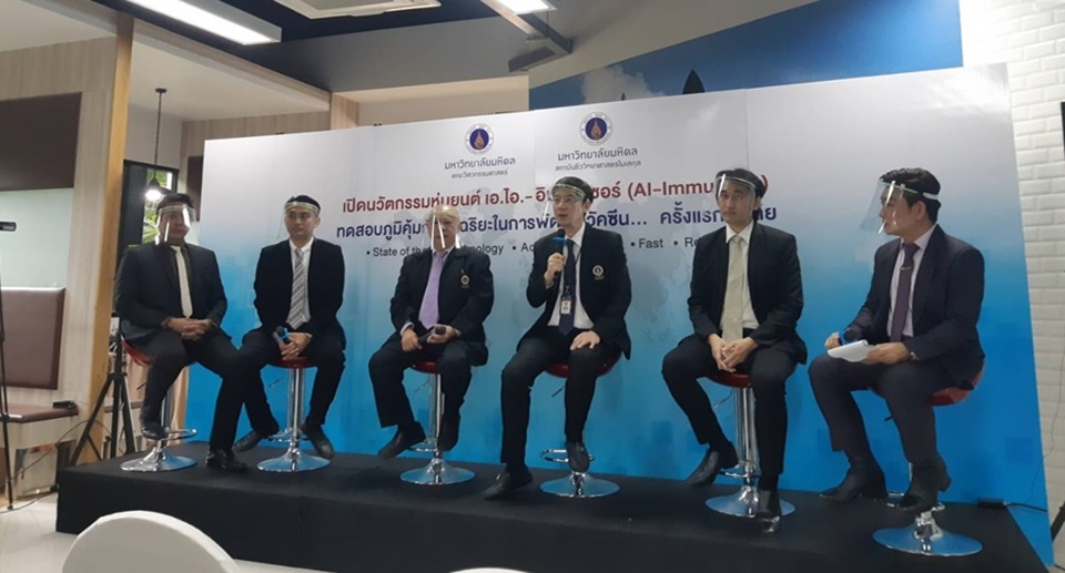 ผศ.ดร.จำรัส พร้อมมาศ ที่ปรึกษาคณบดีคณะวิศวกรรมศาสตร์ มหาวิทยาลัยมหิดล พร้อมด้วย นพ.นรัตถพล เจริญพันธุ์ ผู้อำนวยการสถาบันชีววิทยาศาสตร์โมเลกุล มหาวิทยาลัยมหิดล และดร.พร้อมสิน มาศรีนวล หัวหน้าศูนย์วิจัยและพัฒนาวัคซีน สถาบันชีววิทยาศาสตร์โมเลกุล มหาวิทยาลัยมหิดล และทีมผู้คิดค้นนวัตกรรมจากคณะวิศวกรรมศาสตร์ มหาวิทยาลัยมหิดล ร่วมแถลงข่าวเปิดตัวนวัตกรรม หุ่นยนต์เอไอ-อิมมูไนเซอร์ ซึ่งเป็นหุ่นยนต์ทดสอบภูมิคุ้มกันอัจฉริยะในการพัฒนาวัคซีนครั้งแรกของไทย เพื่อเร่งสนับสนุนและยกระดับการพัฒนาวัคซีนของไทยสู่ระดับโลก ซึ่งเป็นความร่วมมือระหว่างคณะวิศวกรรมศาสตร์ และสถาบันชีววิทยาศาสตร์โมเลกุล โดยระบบเอไอครบวงจร ตั้งแต่ขั้นตอนการจัดเตรียมการเพาะเชื้อไวรัส การทดสอบ การประมวลผล ระบบภาพ บันทึกผล และวิเคราะห์ผลหรือแนวโน้มได้อย่างรวดเร็วและแม่นยำ ลดความเสี่ยงการติดเชื้อและลดภาระขั้นตอนการทำงานของบุคลากรทางการแพทย์ ที่จะเป็นก้าวสำคัญที่ผลักดันการพัฒนาวัคซีนของศูนย์วิจัยวัคซีนต่างๆ ให้ปลอดภัยและสำเร็จเร็วขึ้น