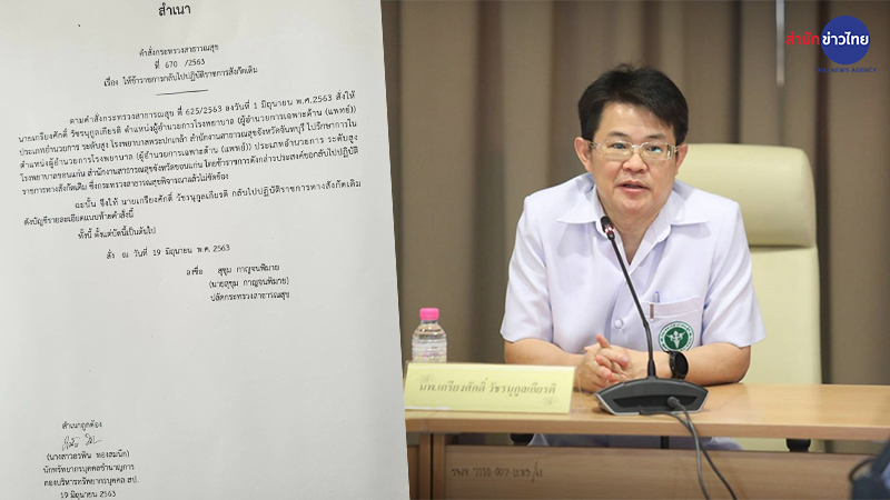 ผู้สื่อข่าวรายงานว่า นพ.สุขุม กาญจนพิมาย ปลัดกระทรวงสาธารณสุข ได้ลงนามในเอกสารสำเนาคำสั่งกระทรวงสาธารณสุข ที่670 /2563 เมื่อวันที่ 19 มิถุนายน 2563 เรื่องให้ข้าราชการกลับไปปฏิบัติราชการสังกัด ระบุว่า การขอกลับไปปฏิบัติราชการทางสังกัดเดิมของ นพ.เกรียงศักดิ์ วัชรนุกูลเกียรติ กระทรวงสาธารณสุข พิจารณาแล้วไม่ขัดข้อง จึงให้ นพ.เกรียงศักดิ์ กลับไปปฏิบัติราชการตำแหน่ง ผู้อำนวยการโรงพยาบาลพระปกเกล้า จังหวัดจันทบุรี ตั้งแต่บัดนี้เป็นต้นไป