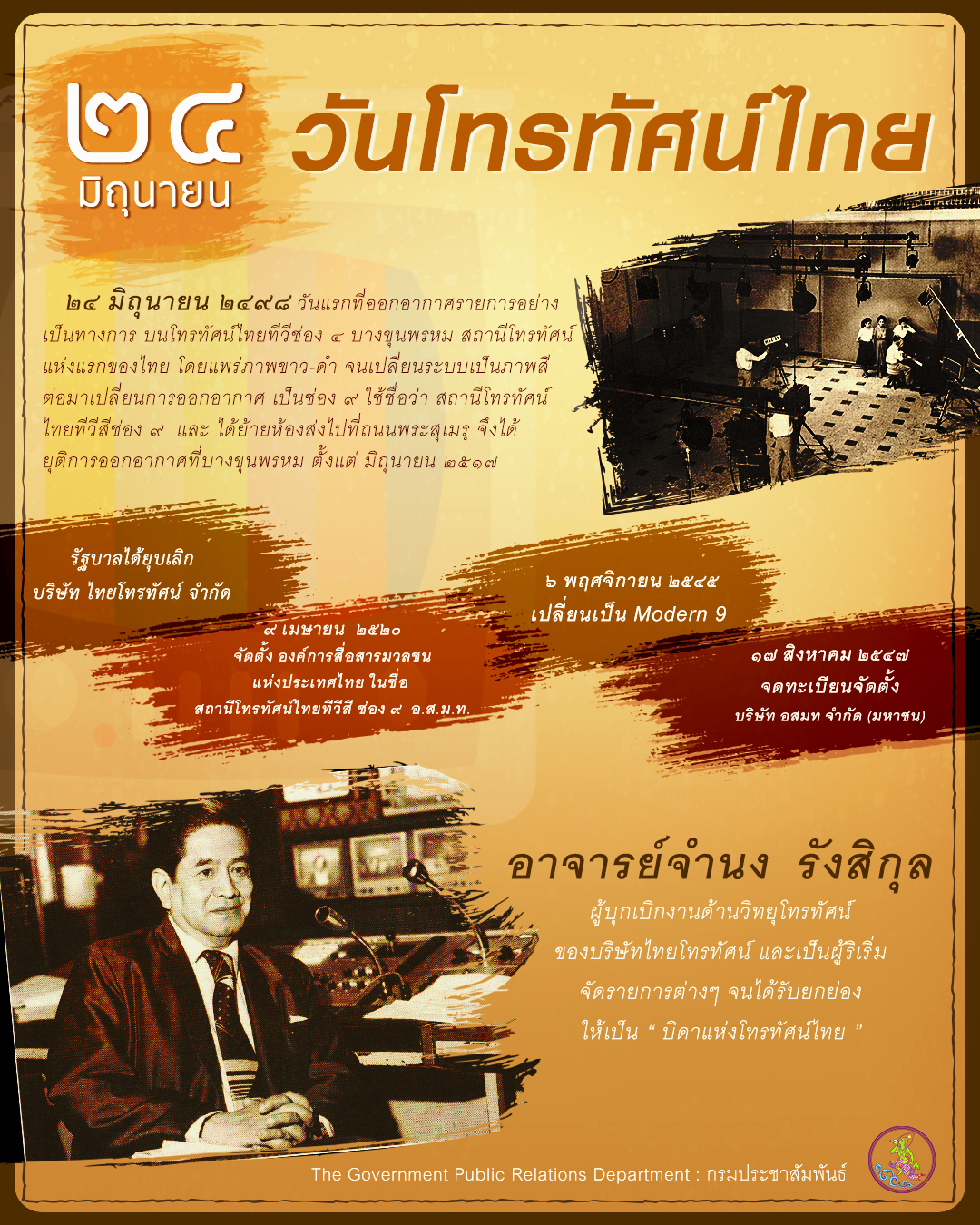 สำนักข่าวไทย 24 มิ.ย. 63 – เมื่อวันที่ 24 มิถุนายน พ.ศ. 2498 มีพิธีเปิดและแพร่สัญญาณสถานีโทรทัศน์ ช่อง 4 บางขุนพรหม ซึ่งเป็นสถานีวิทยุโทรทัศน์แห่งแรกของประเทศไทย ดำเนินงานภายใต้การบริหารของบริษัท ไทยโทรทัศน์ จำกัด โดยมีพิธีเปิดและแพร่สัญญาณ เมื่อวันที่ 24 มิถุนายน 2498 มีชื่อเรียกขานตามอนุสัญญาสากลว่าด้วยวิทยุโทรทัศน์ว่า HS1-TV ตั้งอยู่ที่วังบางขุนพรหม ที่ทำการของธนาคารแห่งประเทศไทยในปัจจุบัน ราวเดือนมิถุนายน พ.ศ. 2517 ได้หยุดทำการออกอากาศในระบบ 525 เส้น ทางช่อง 4 โดยได้ย้ายห้องส่งโทรทัศน์ไปที่ ถ.พระสุเมรุ แขวงบางลำพู และราว พ.ศ. 2519 ได้เปลี่ยนระบบการออกอากาศจากภาพขาวดำเป็นภาพสี ในระบบ 625 เส้น ทางช่อง 9 อย่างสมบูรณ์ พร้อมกับเปลี่ยนชื่อเป็นสถานีโทรทัศน์ไทยทีวีสี ช่อง 9 ต่อมาเมื่อวันที่ 3 กุมภาพันธ์ พ.ศ. 2520 คณะรัฐมนตรีมีมติให้ยุบเลิกกิจการบริษัท ไทยโทรทัศน์ จำกัด.-สำนักข่าวไทย