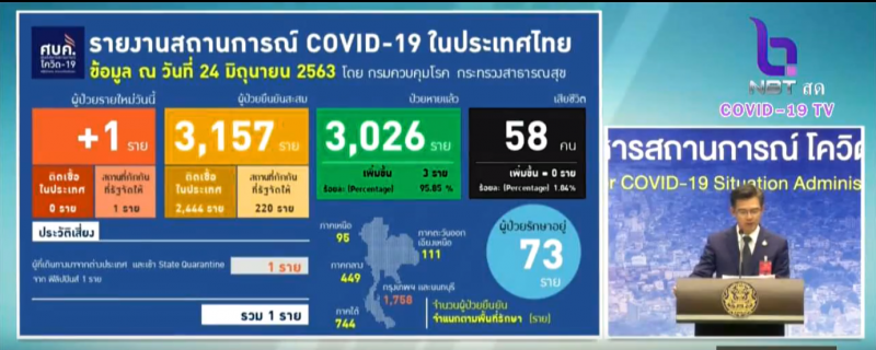 Dr. Taweesin Visanuyothin, spokesman of the Center for Covid-19 Situation Administration (CCSA) said the new case was a 31-year-old man, a restaurant staff, who returned to Thailand on June 17 and was in state quarantine.