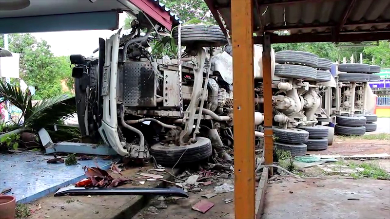 การสอบสวนพยานแวดล้อมทราบว่าขณะที่รถบรรทุกน้ำดื่มเปิดไฟเลี้ยวและชะลอความเร็ว ประกอบกับเป็นช่วงทางลาดขึ้นเขา มีรถพ่วง 18 ล้อ บรรทุกหินคลุกวิ่งออกมาจากโรงโม่พอดีหักหลบไม่ทันเฉี่ยวชนท้ายรถบรรทุกน้ำดื่มแล้วเสียหลักพุ่งเข้าบ้านเรือน ซึ่งเจ้าหน้าที่จะรอสอบปากคำคนขับรถพ่วงที่บาดเจ็บอีกครั้ง ก่อนดำเนินการตามกฎหมาย.-สำนักข่าวไทย