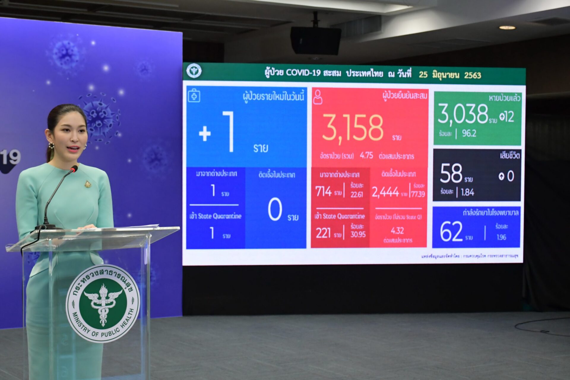 พญ.พรรณประภา ยงค์ตระกูล ผู้ช่วยโฆษกศูนย์บริหารสถานการณ์การแพร่ระบาดของโรคติดเชื้อไวรัสโควิด-19 (ศบค.) กล่าวในการแถลงข่าวสถานการณ์โรคโควิด-19 ว่า วันนี้พบจำนวนผู้ติดเชื้อรายใหม่เพิ่ม 1 คน อยู่ในสถานที่เฝ้าระวังที่รัฐจัดให้ โดยผู้ป่วยรายใหม่เดินทางมาจากประเทศอียิปต์. เป็นเพศชายอายุ 24 ปี อาชีพนักศึกษา เดินทางมาถึงประเทศไทย วันที่ 9 มิ.ย.ที่ผ่านมา และเข้าพักในสถานที่เฝ้าระวังที่รัฐจัดให้ ที่ จ.ชลบุรี ก่อนหน้านี้มีผู้โดยสารที่เดินทางมาเที่ยวบินเดียวกัน 2 คน ติดเชื้อแต่ไม่มีอาการ สำหรับผู้ป่วยรายใหม่นี้ตรวจเชื้อครั้งแรกวันที่ 13 มิ.ย.ไม่พบเชื้อและตรวจในครั้งที่ 2 วันที่ 23 มิ.ย.ที่ผ่านมาพบติดเชื้อแต่ไม่มีอาการ รวมผู้ป่วยสะสมขณะนี้มีทั้งสิ้น 3,158 ราย เป็นผู้ป่วยติดเชื้อภายในประเทศ 2,444 คน และเป็นผู้ป่วยที่ตรวจพบในสถานที่เฝ้าระวังที่รัฐจัดให้ 221 คน ทั้งนี้ยังมีผู้ป่วยรักษาหาย 12 คน. รวมรักษาหายกลับบ้านได้แล้ว 3,038 คน และยังคงรักษาตัวในโรงพยาบาล 62 คน ส่วนผู้เสียชีวิตไม่มีเพิ่มคงอยู่ที่ 58 คน