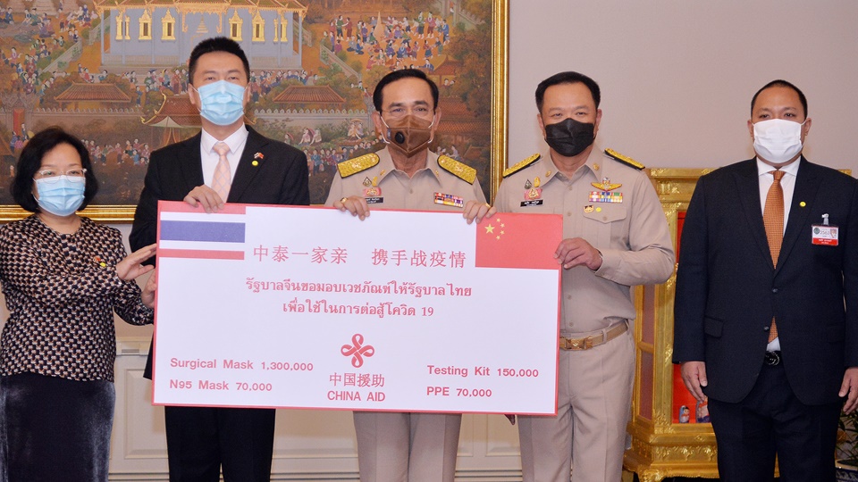 นางนฤมล ภิญโญสินวัฒน์ โฆษกประจำสำนักนายกรัฐมนตรี เปิดเผยว่า พล.อ. ประยุทธ์ จันทร์โอชา นายกรัฐมนตรีและรัฐมนตรีว่าการกระทรวงกลาโหม รับมอบเวชภัณฑ์และอุปกรณ์ทางการแพทย์ จากนายหยาง ซิน (Mr. Yang Xin) อุปทูตรักษาราชการแทนเอกอัครราชทูตจีนประจำประเทศไทย ในฐานะตัวแทนรัฐบาลจีน ได้แก่หน้ากากอนามัย จำนวน 1,300,000 ชิ้น หน้ากาก N95 จำนวน 70,000 ชิ้น ชุดตรวจ Test Kit COVID-19 จำนวน 150,000 ชุด และ ชุด PPE จำนวน 70,000 ชุด