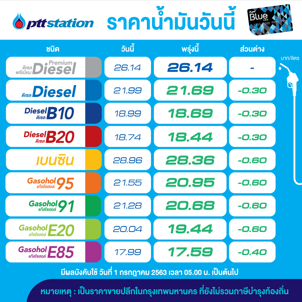เวลา 05.00 น. เป็นต้นไป โดยราคาขายปลีก ของ พีทีทีสเตชั่น จะเป็นดังนี้ เบนซิน 28.36 บาท/ลิตร , แก๊สโซฮอล์ 95 ราคา 20.95