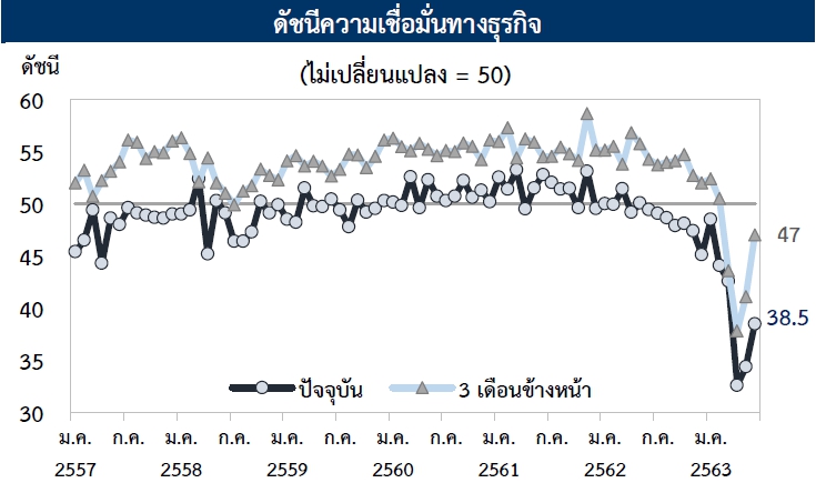 ธนาคารแห่งประเทศไทย เปิดเผย ดัชนีความเชื่อมั่นทางธุรกิจเดือนมิถุนายน 2563 เพิ่มขึ้นมาอยู่ที่ระดับ 38.5 เทียบกับระดับ 34.4 ในเดือนก่อน โดยเป็นการปรับตัวเพิ่มขึ้นในเกือบทุกภาคธุรกิจ และจากองค์ประกอบด้านการผลิต คำสั่งซื้อ และผลประกอบการเป็นสำคัญ อย่างไรก็ตาม ดัชนีฯ ยังอยู่ต่ำกว่าระดับ 50 สะท้อนว่าผู้ประกอบการส่วนใหญ่ยังเห็นว่าภาวะธุรกิจในระยะข้างหน้าจะแย่ลงจากปัจจุบัน แม้จะกลับมาเปิดเมืองได้เกือบเป็นปกติแล้ว แต่ผู้ประกอบการส่วนใหญ่ยังมีความเชื่อมั่นอยู่ในระดับต่ำใกล้เคียงกับเดือนก่อน ส่วนหนึ่งจากกำลังซื้อที่ลดลงและการรักษามาตรการเว้นระยะห่าง ทำให้รายได้ของธุรกิจยังกลับมาไม่มากนัก ซึ่งบางส่วนมองว่าอาจยังไม่คุ้มที่จะกลับมาเปิดให้บริการ อย่างไรก็ดี ดัชนีฯ ที่ปรับเพิ่มขึ้นมาจากองค์ประกอบด้านการผลิต ค่าสั่งซื้อ และผลประกอบการที่ปรับดีขึ้นมาก แต่ด้านการจ้างงานดีขึ้นเพียงเล็กน้อย แสดงว่าแม้การผลิตและการบริการจะเริ่มฟื้นตัว แต่ส่งผลดีไปสู่การจ้างงานไม่มากนัก