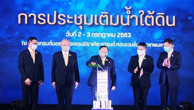 เมื่อเวลา 10.00 น. วันนี้ (2 ก.ค.) ที่โรงแรมมิราเคิล แกรนด์ คอนเวนชั่น กรุงเทพฯ พล.อ.ประวิตร วงษ์สุวรรณ รองนายกรัฐมนตรี เป็นประธานในพิธีเปิดการประชุมเติมน้ำใต้ดิน โดยมีผู้เข้าร่วมประชุม อาทิ ผู้ว่าราชการจังหวัด ท้องถิ่นจังหวัด หน่วยบัญชาการทหารพัฒนา และผู้อำนวยการสำนักงานทรัพยากรธรรมชาติและสิ่งแวดล้อมจังหวัด โดยมีวัตถุประสงค์เพื่อซักซ้อมความเข้าใจในหลักเกณฑ์และแนวทางการเติมน้ำใต้ดินที่ถูกต้องตามหลักวิชาการ และร่วมเสวนาเสริมสร้างองค์ความรู้ด้านน้ำบาดาลในการปฏิบัติงานเติมน้ำใต้ดินให้เป็นไปตามมาตรฐานของประเทศไทย ซึ่งรองนายกรัฐมนตรี (พลเอก ประวิตร วงษ์สุวรรณ) ในฐานะผู้อำนวยการกองอำนวยการน้ำแห่งชาติ ได้สั่งการในที่ประชุม เมื่อวันที่ 11 มิถุนายน 2563 ให้เร่งพัฒนางานเติมน้ำใต้ดิน โดยมอบหมายให้สำนักงานทรัพยากรน้ำแห่งชาติ และกระทรวงทรัพยากรธรรมชาติและสิ่งแวดล้อม โดยกรมทรัพยากรน้ำบาดาล เป็นเจ้าภาพหลัก พร้อมให้หน่วยงานที่เกี่ยวข้องเร่งจัดทำแผนการพัฒนาบ่อน้ำบาดาลและการเติมน้ำใต้ดินตามหลักเกณฑ์ที่กรมทรัพยากรน้ำบาดาลเสนอ โดยเฉพาะท้องถิ่นให้เข้ามามีส่วนร่วม ในการกำหนดพื้นที่ดำเนินการเก็บน้ำใต้ดินให้มากขึ้น