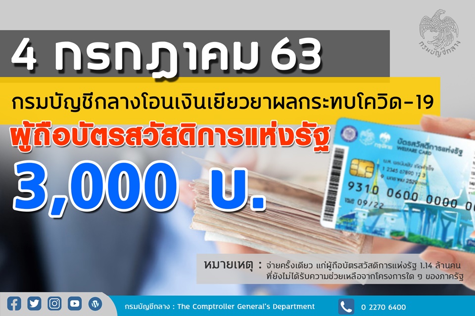 นางสาววิลาวรรณ พยาน้อย รองอธิบดีกรมบัญชีกลาง ในฐานะโฆษกกรมบัญชีกลาง เปิดเผยว่า ตามที่คณะรัฐมนตรีมีมติเห็นชอบผลการพิจารณาของคณะกรรมการกลั่นกรองใช้จ่ายเงินกู้ ที่อนุมัติให้กระทรวงการคลังช่วยเหลือ เยียวยา และชดเชยให้แก่ผู้ถือบัตรสวัสดิการแห่งรัฐ ที่ยังไม่ได้รับความช่วยเหลือจากโครงการใด ๆ ของภาครัฐ ในช่วงที่มีการแพร่ระบาดของโรคติดเชื้อโควิด-19 ซึ่งสำนักงานเศรษฐกิจการคลัง (สศค.) ตรวจสอบแล้วพบว่ามีผู้ถือบัตรสวัสดิการแห่งรัฐที่ยังไม่เคยได้รับสิทธิ์ 1.14 ล้านคน โดยผู้มีสิทธิ์จะได้รับเงินช่วยเหลือเยียวยาเดือนละ 1,000 บาท เป็นระยะเวลา 3 เดือน (พฤษภาคม-กรกฎาคม 2563) รวมเป็นเงิน 3,000 บาท/คน