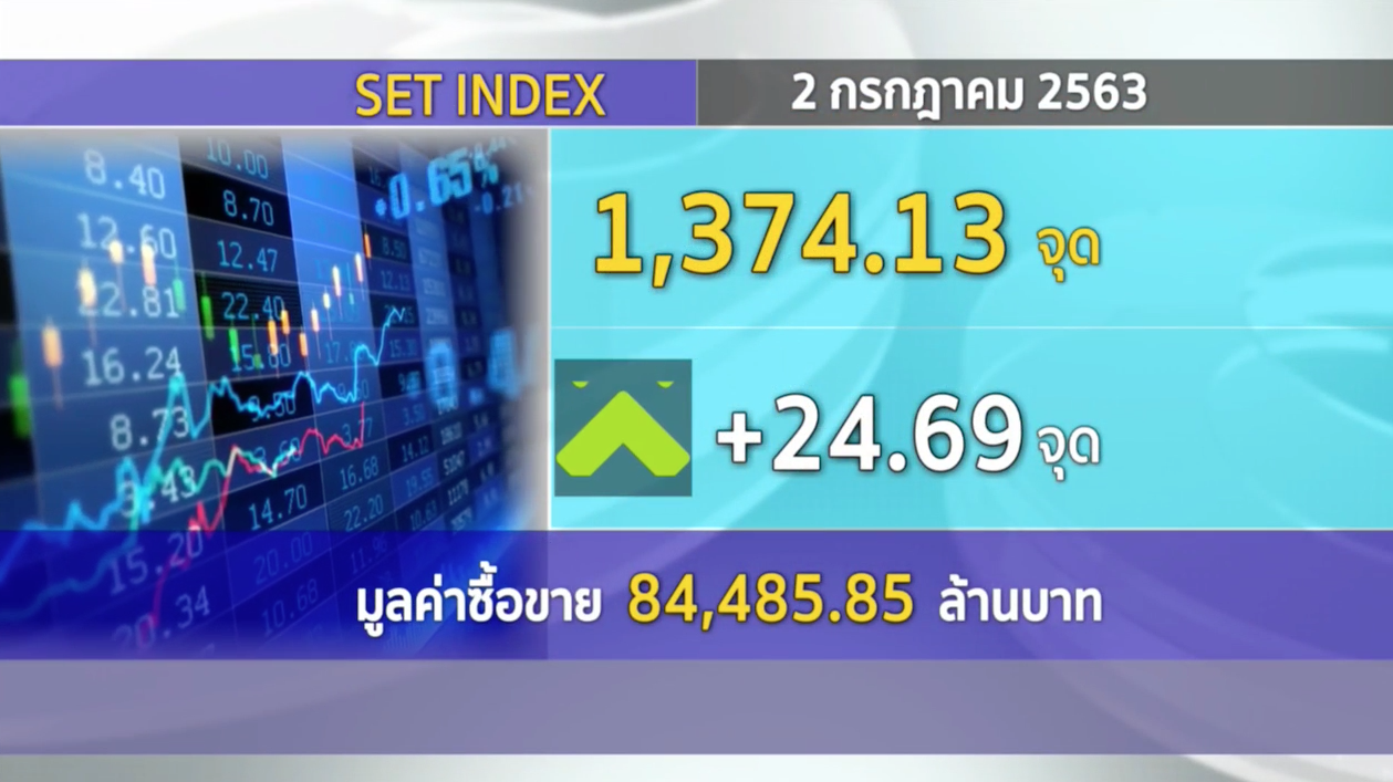 กทม. 2 ก.ค.- ดัชนีตลาดหลักทรัพย์ฯ ปิดวันนี้ (2 ก.ค.) ที่ระดับ 1,374.13 จุด เพิ่มขึ้น 24.69 จุด หรือ 1.83% มูลค่าการซื้อขาย 84,485.85 ล้านบาท โดยดัชนีเคลื่อนไหวแดนบวกตลอดทั้งวัน โดยดัชนีทำระดับสูงสุดที่ 1,376.31 จุด และทำระดับต่ำสุด 1,353.50 จุด.-สำนักข่าวไทย
